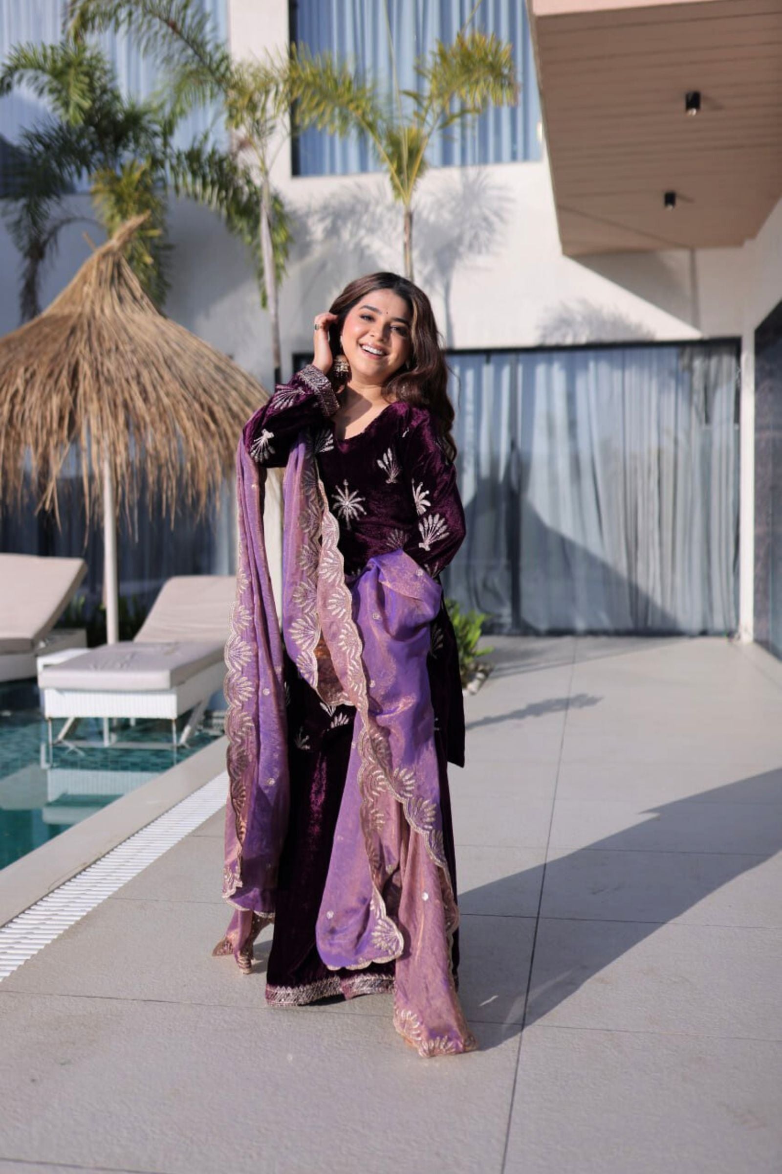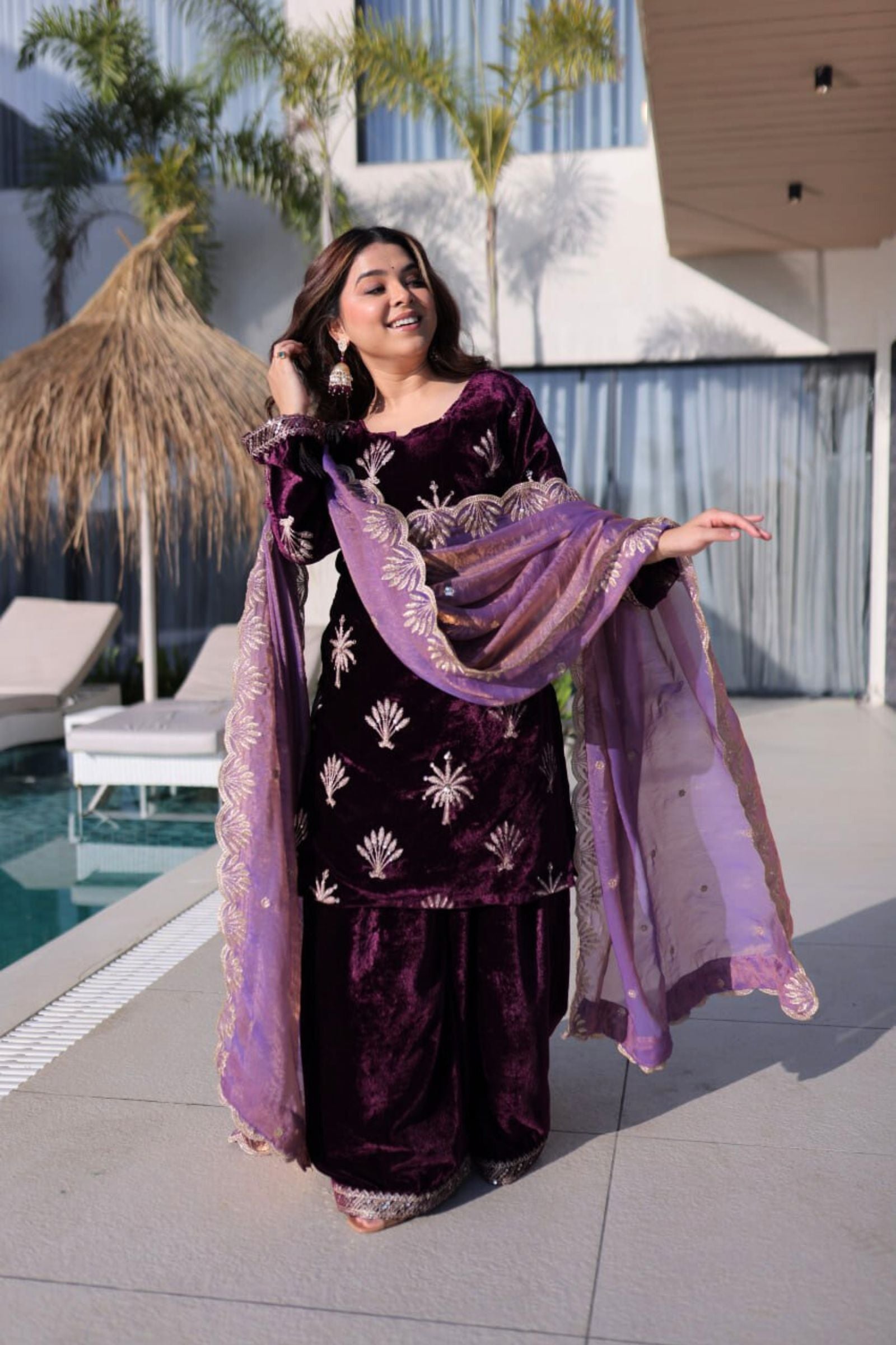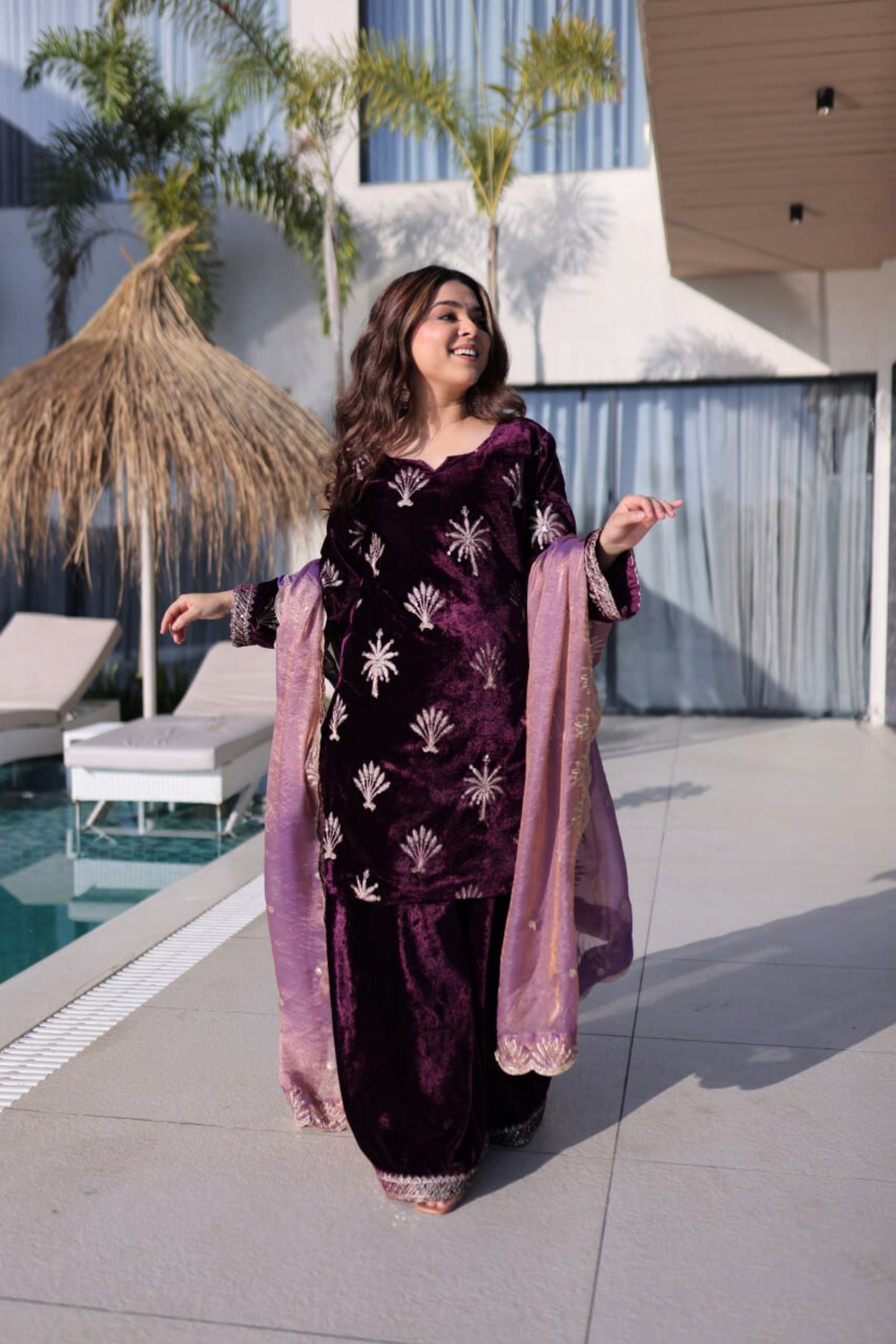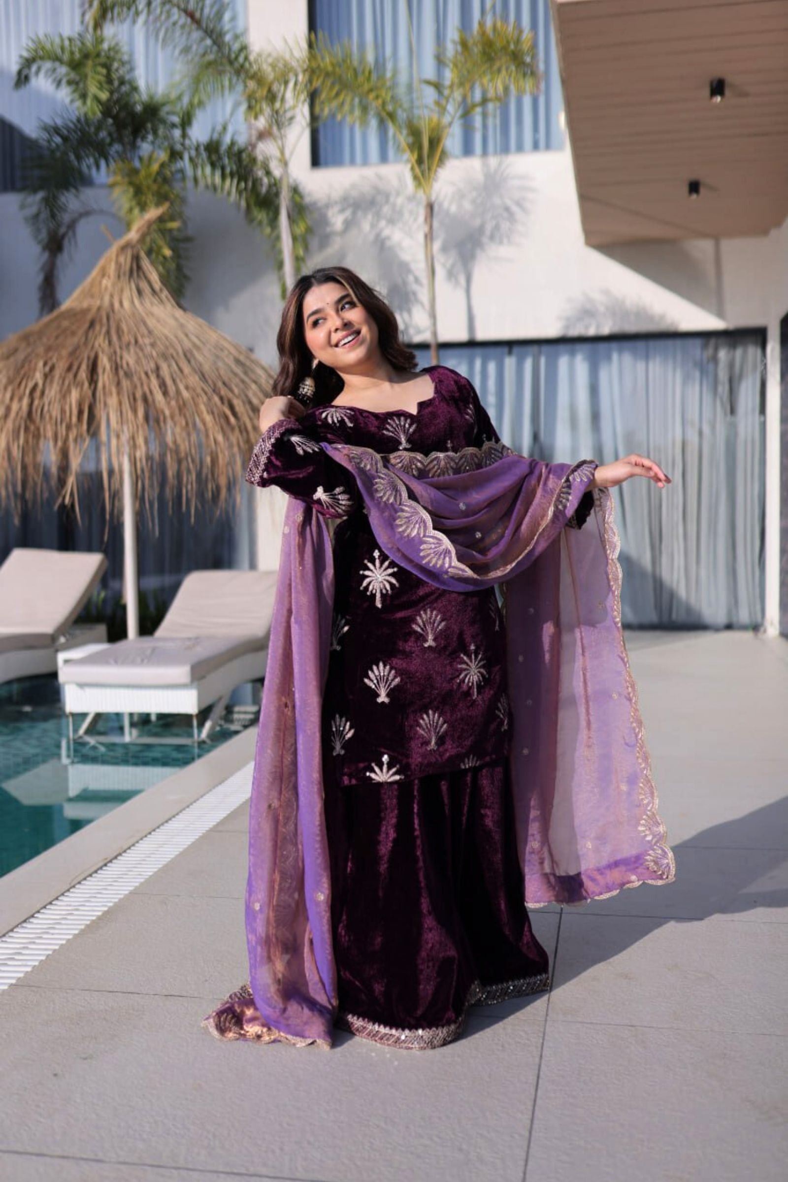 Step into regal elegance with the Grape Vine Velvet Suit Set. Its rich velvet fabric, adorned with intricate sequins and zari embroidery, exudes luxury and sophistication. Paired with a matching dupatta and perfectly crafted pants, this ensemble is designed to make you shine at weddings, festive occasions, or grand celebrations.