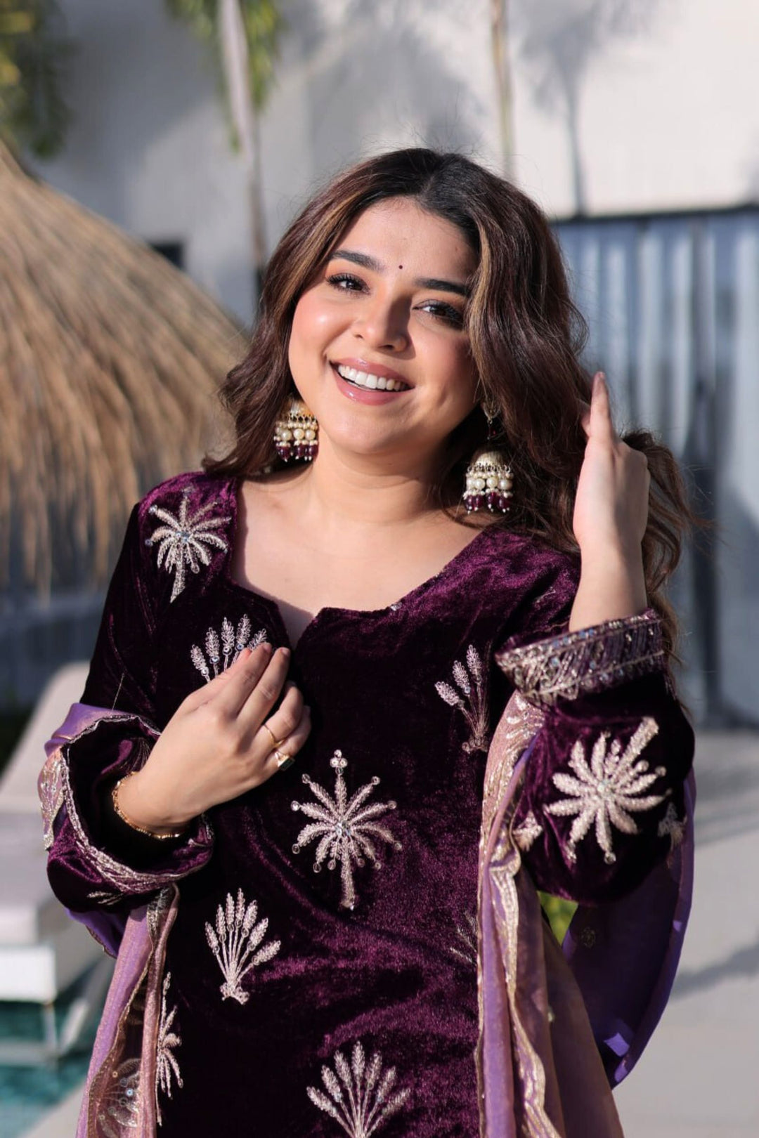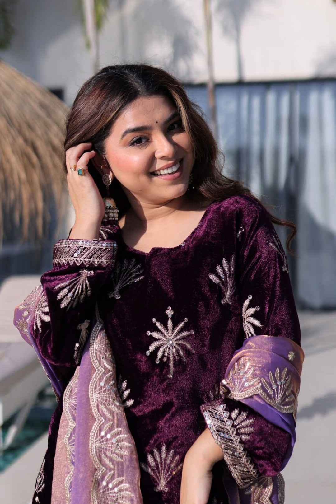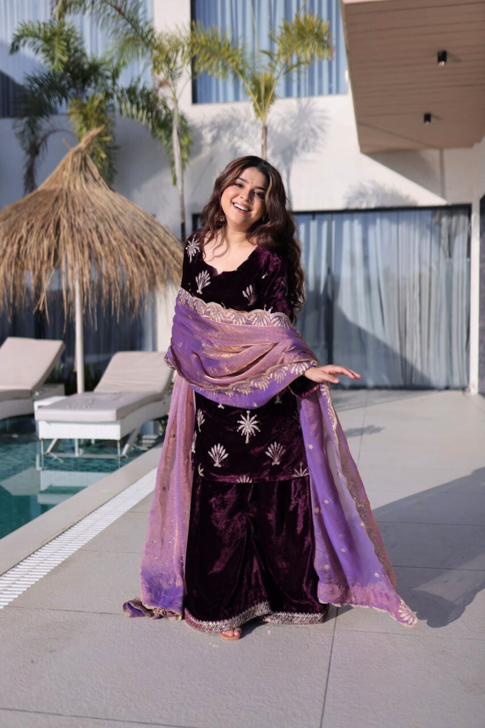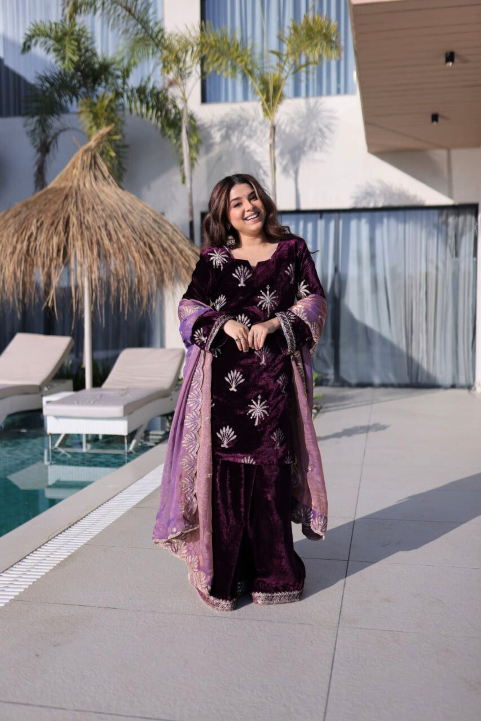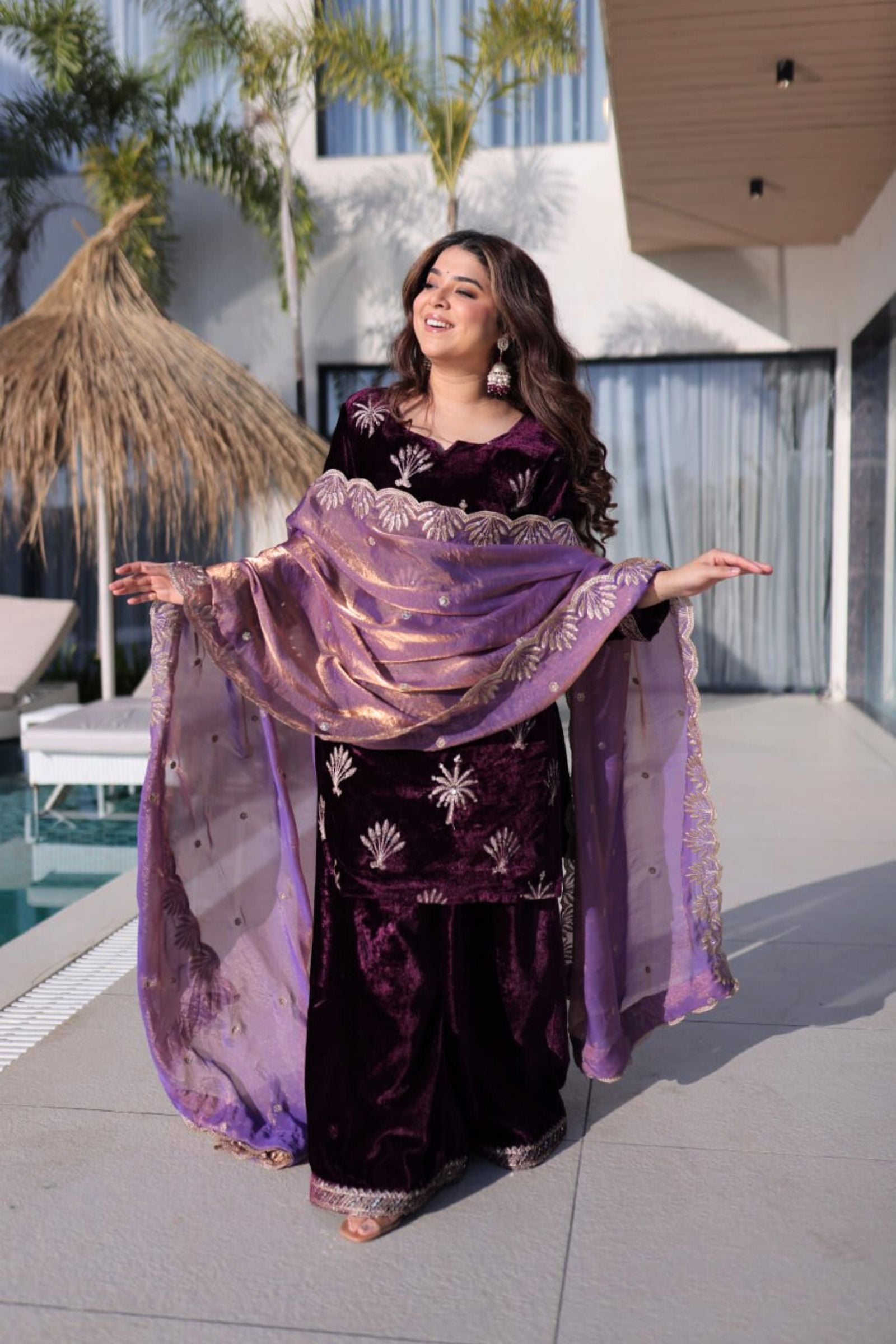 Step into regal elegance with the Grape Vine Velvet Suit Set. Its rich velvet fabric, adorned with intricate sequins and zari embroidery, exudes luxury and sophistication. Paired with a matching dupatta and perfectly crafted pants, this ensemble is designed to make you shine at weddings, festive occasions, or grand celebrations.