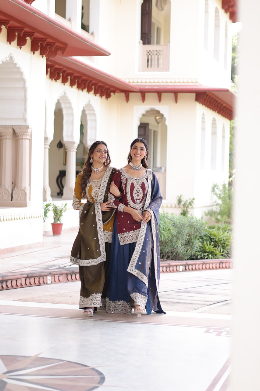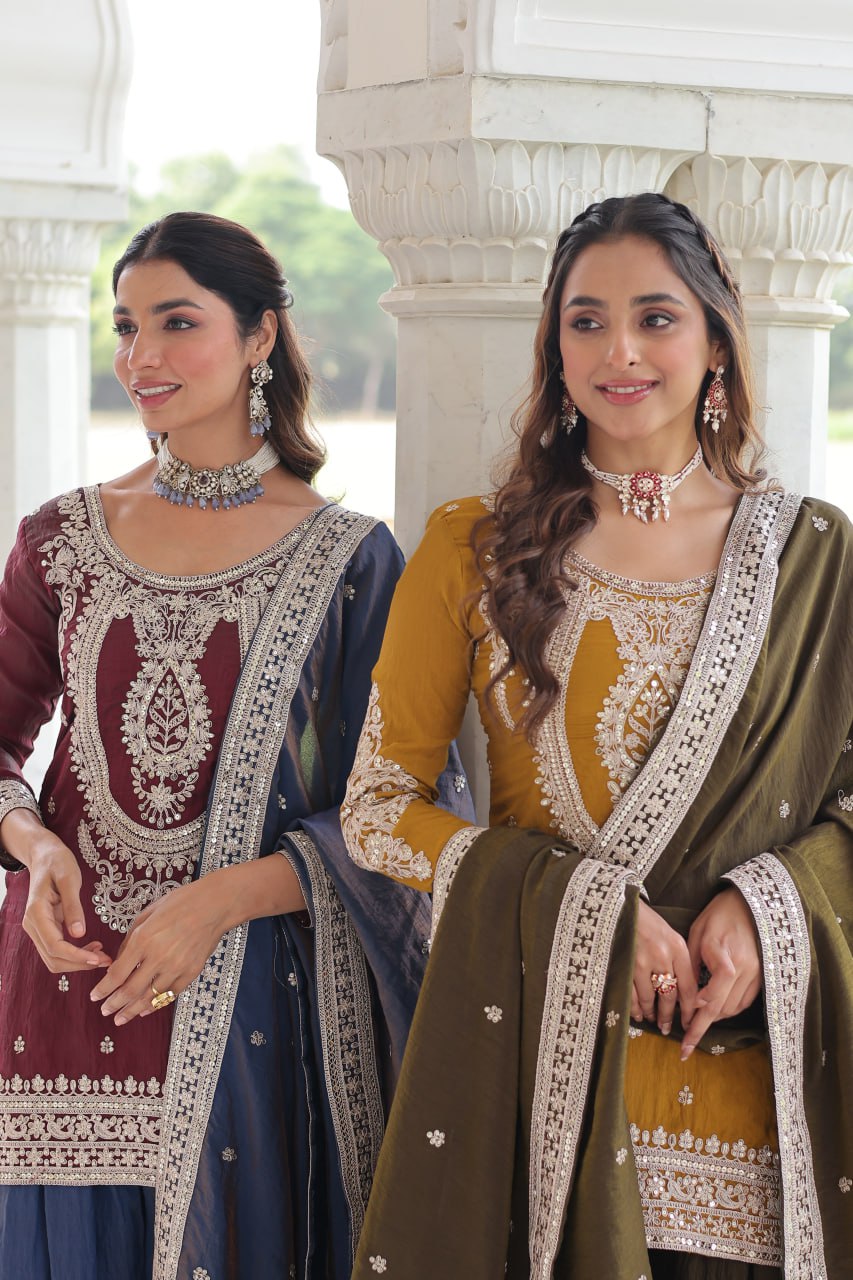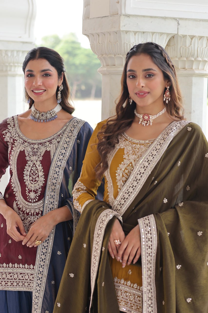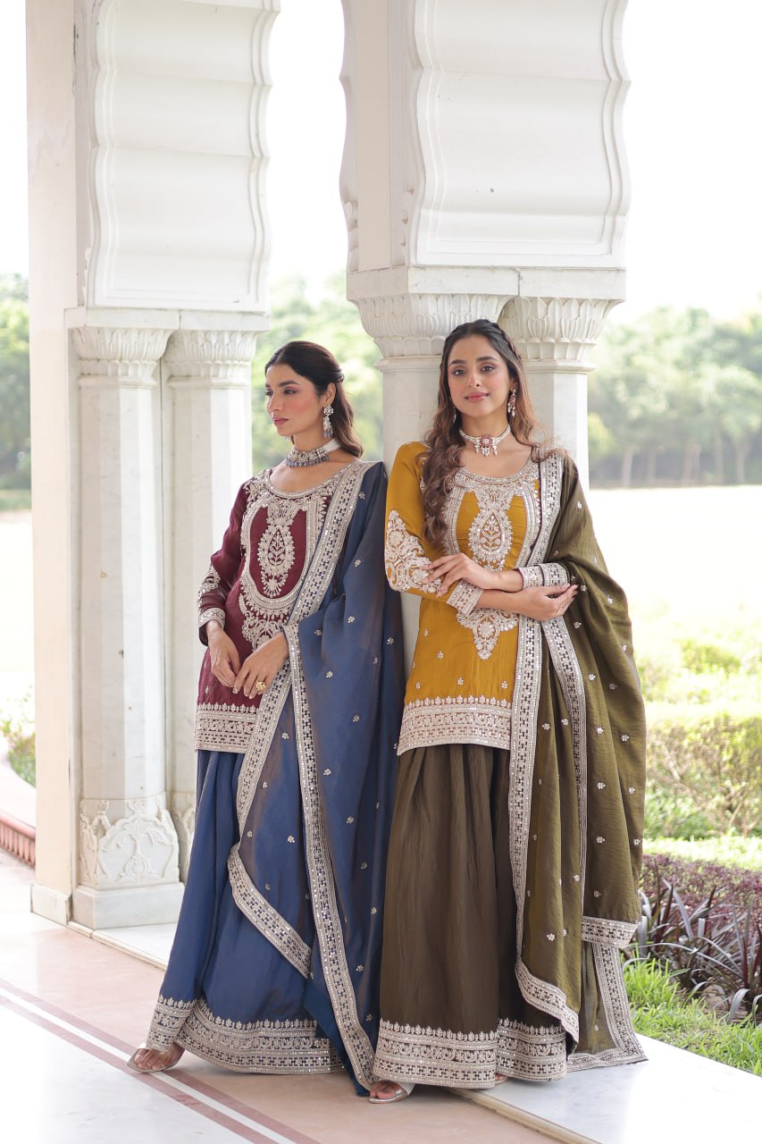 The Midnight & Mocha Sharara Ensemble blends sophistication with comfort. Crafted in rich Silk fabric, the fully lined top features intricate sequin embroidery, while the flared sharara offers effortless elegance. Paired with a delicately embroidered dupatta, this ready-to-wear set captures modern ethnic charm, perfect for grand celebrations and stylish parties.