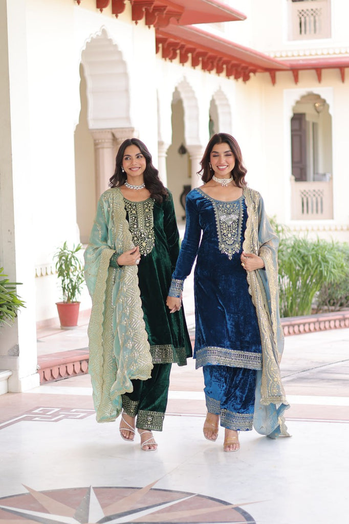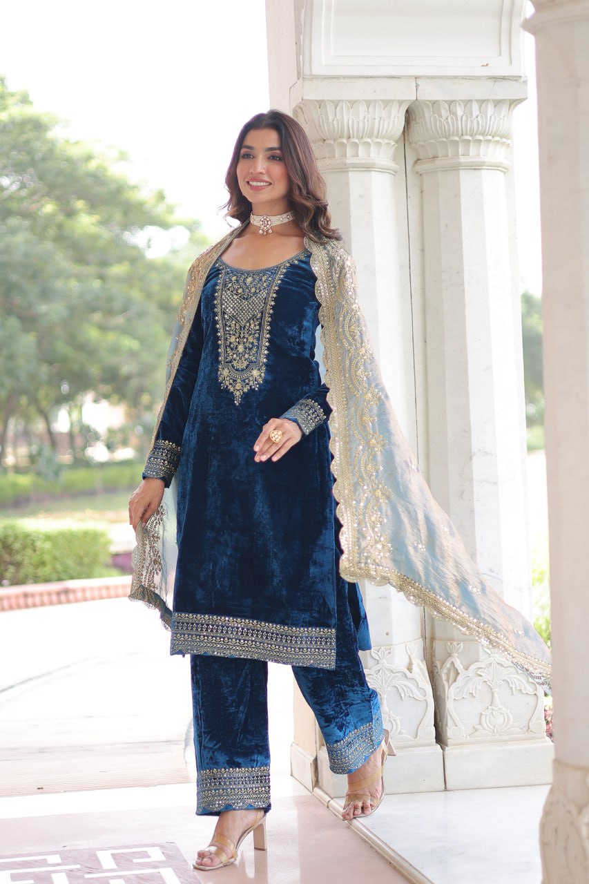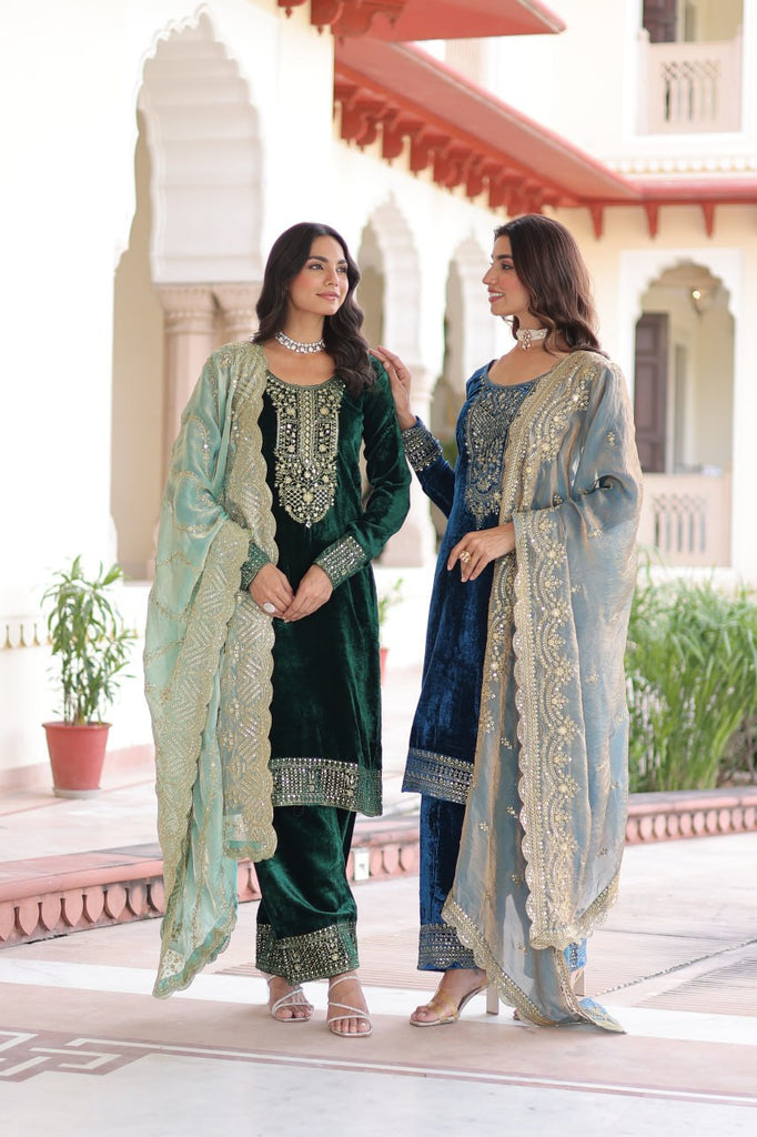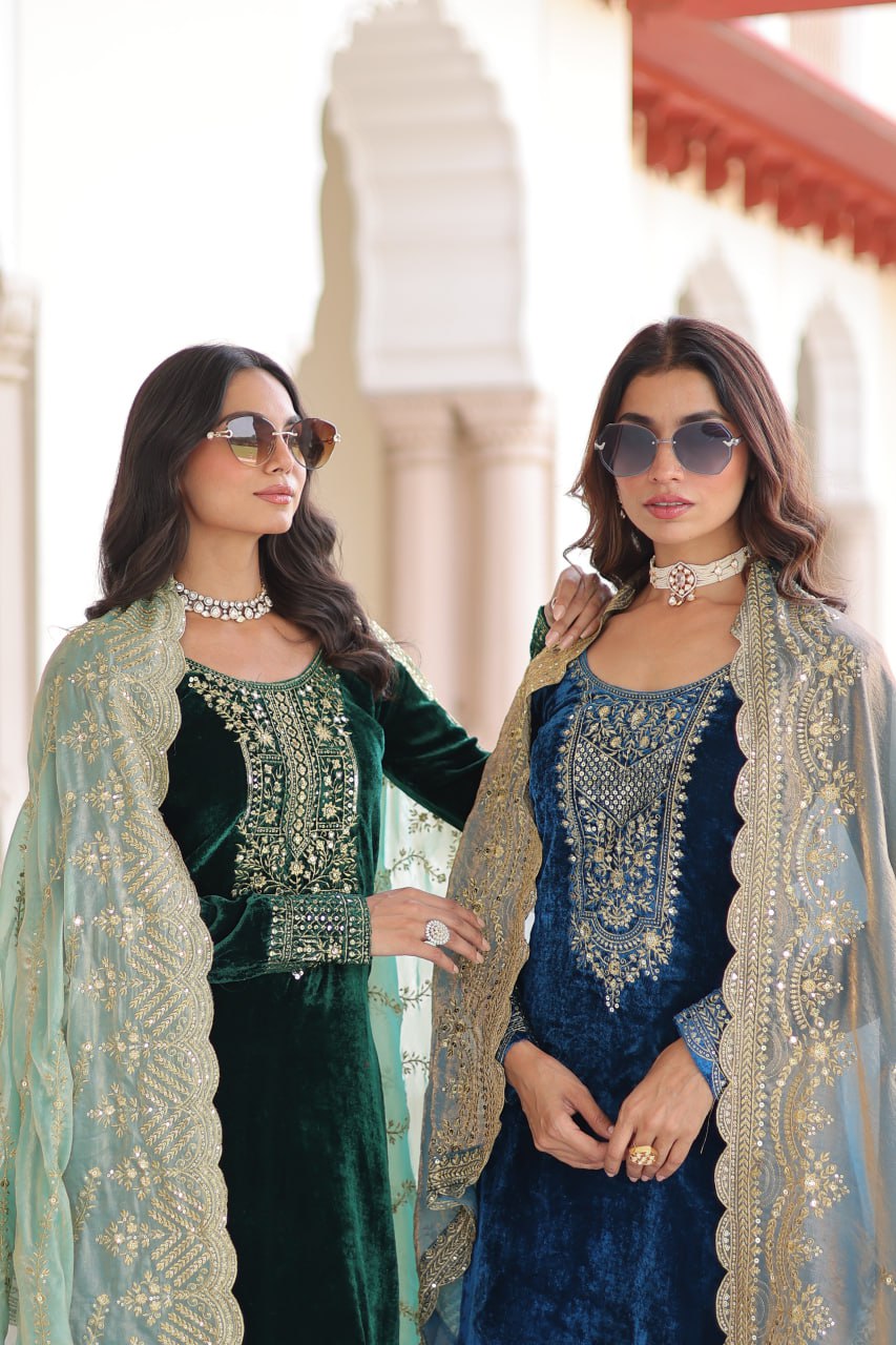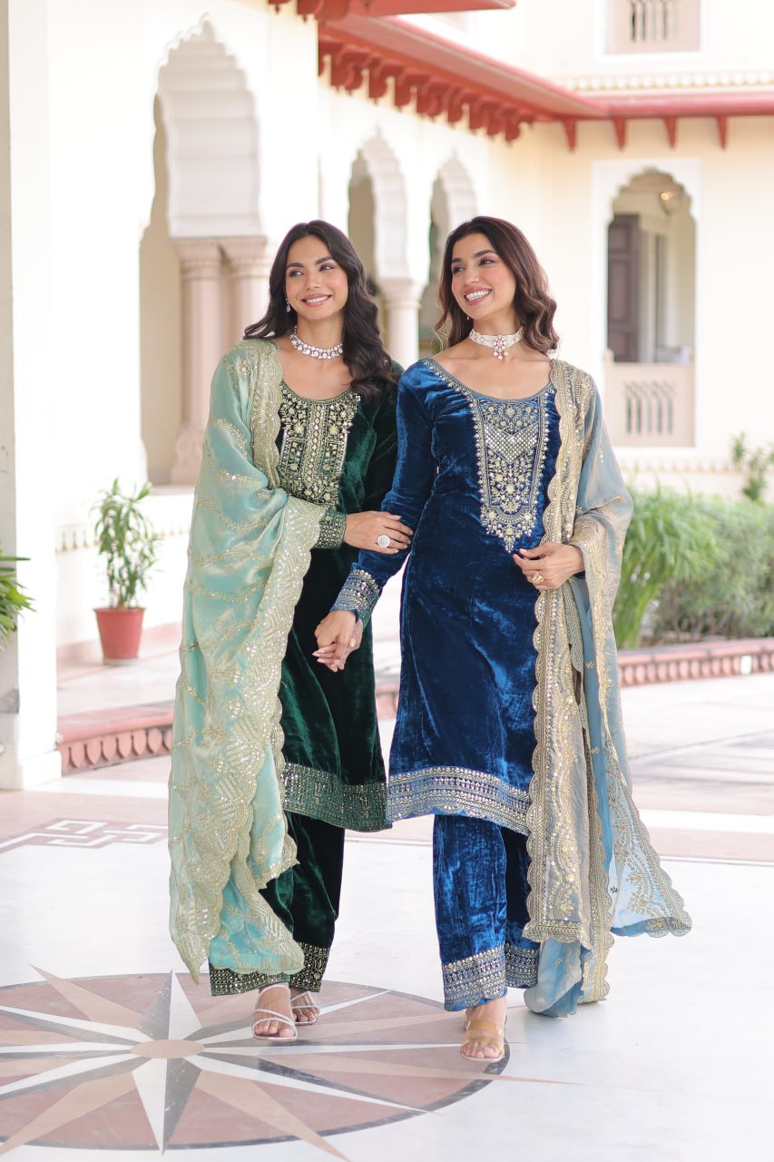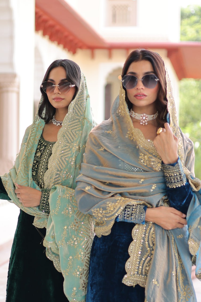 Step into regal elegance with the Royal Zari Velvet Suit Set. Its rich velvet fabric, adorned with intricate sequins and zari embroidery, exudes luxury and sophistication. Paired with a matching dupatta and perfectly crafted pants, this ensemble is designed to make you shine at weddings, festive occasions, or grand celebrations.