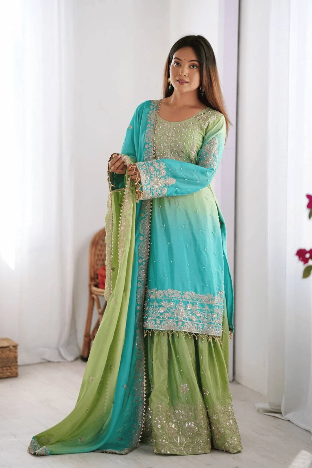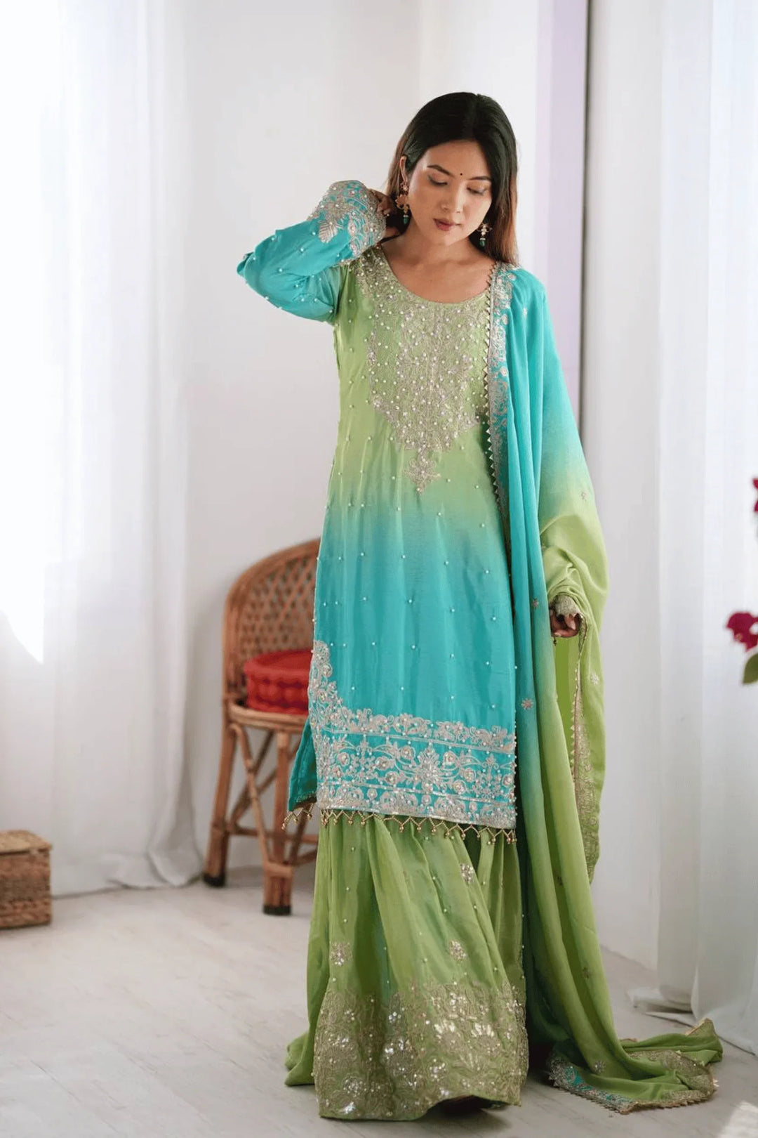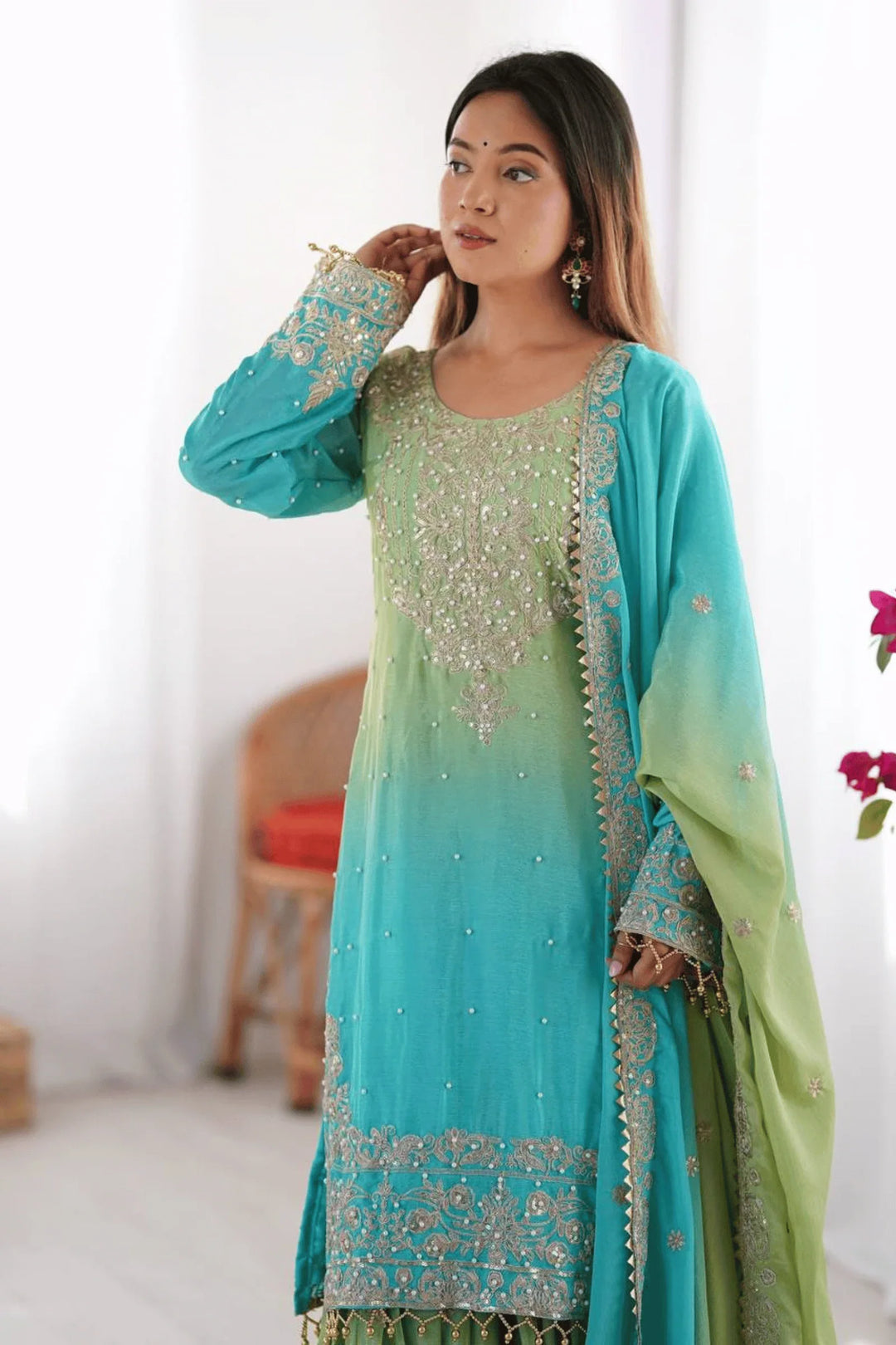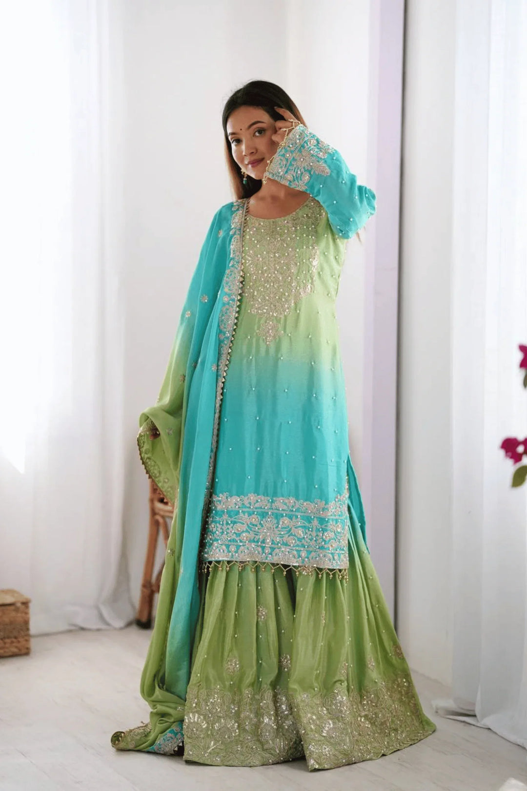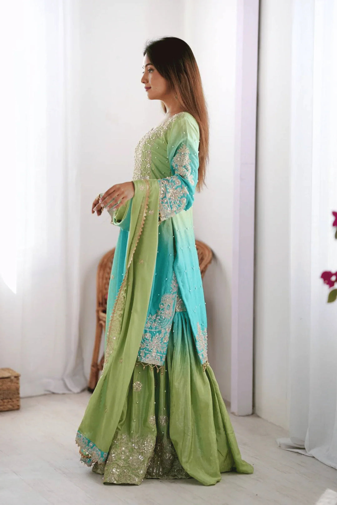 Adorn yourself in elegance with the Glamwiz Aqua Green Ombre Sharara Suit.