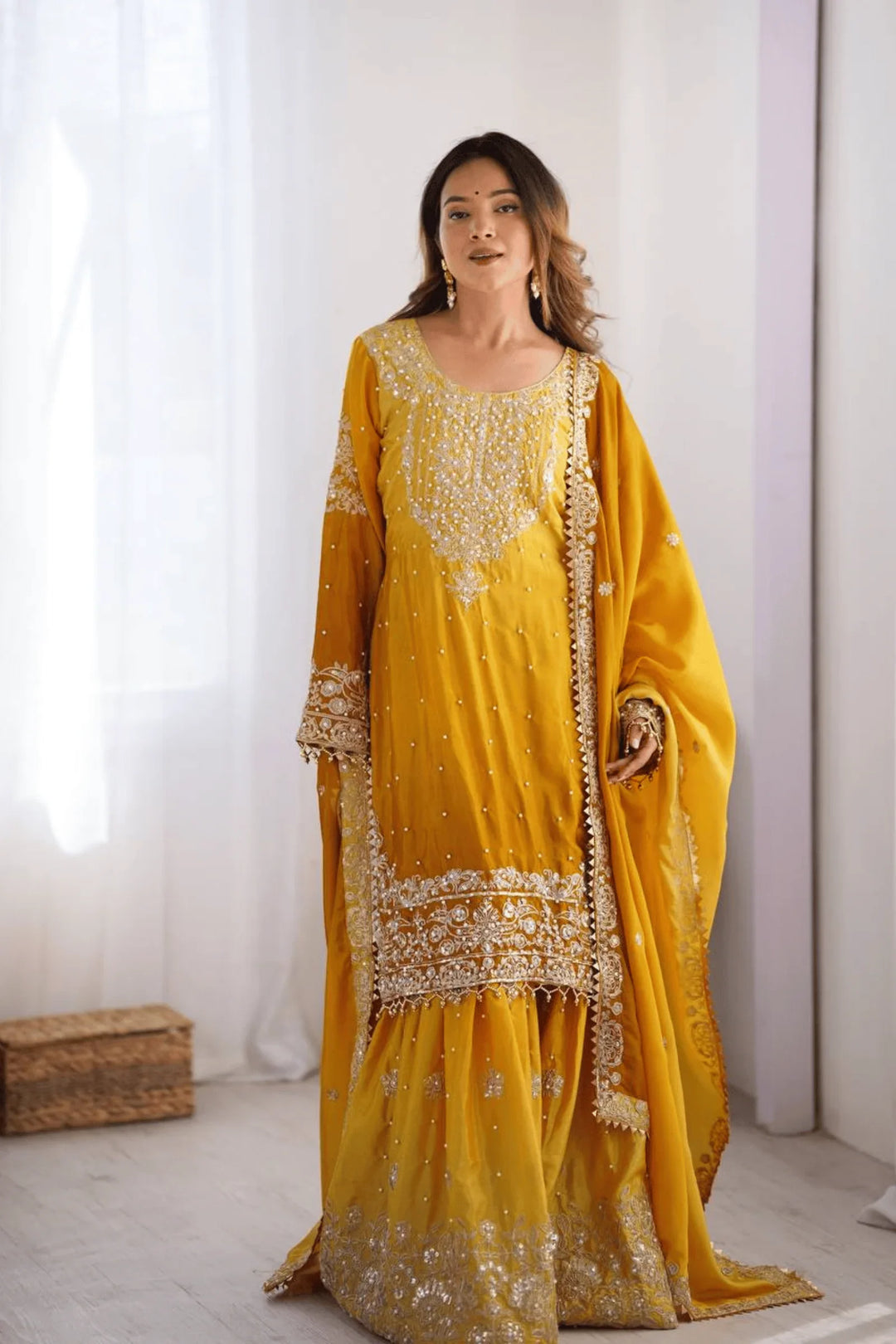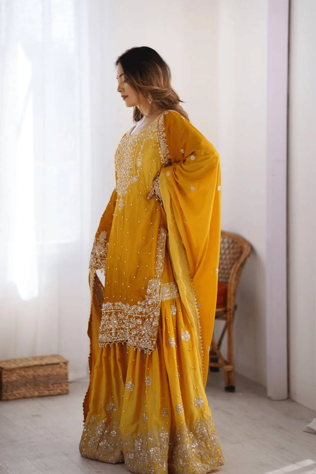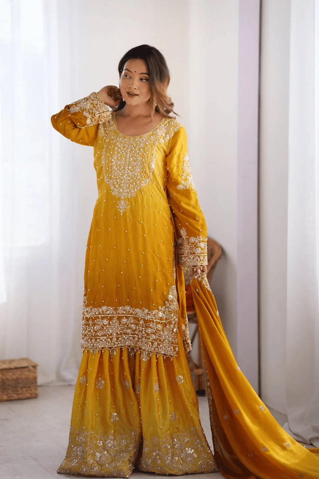 Adorn yourself in elegance with the Glamwiz Golden Mustard Sharara Suit.