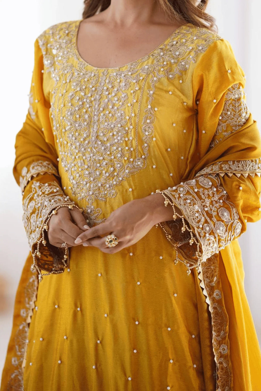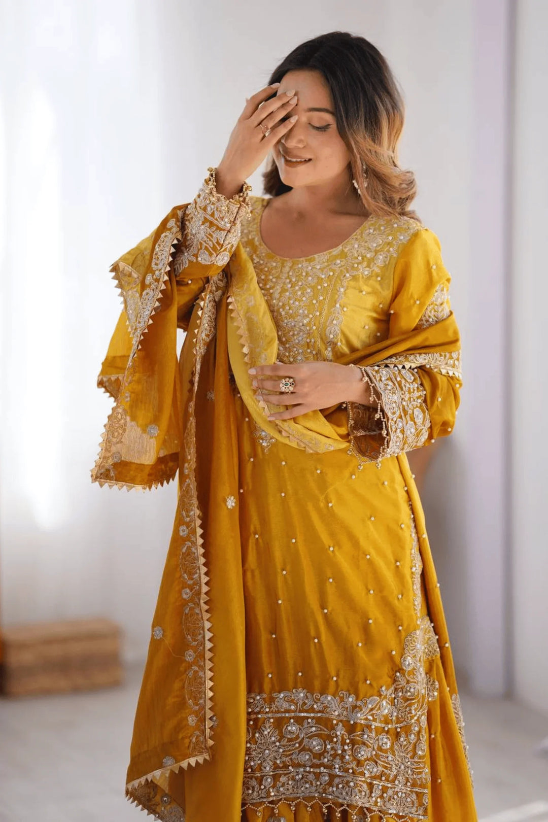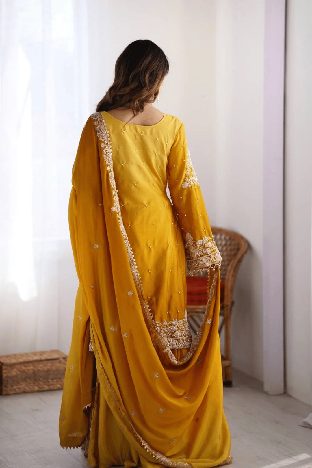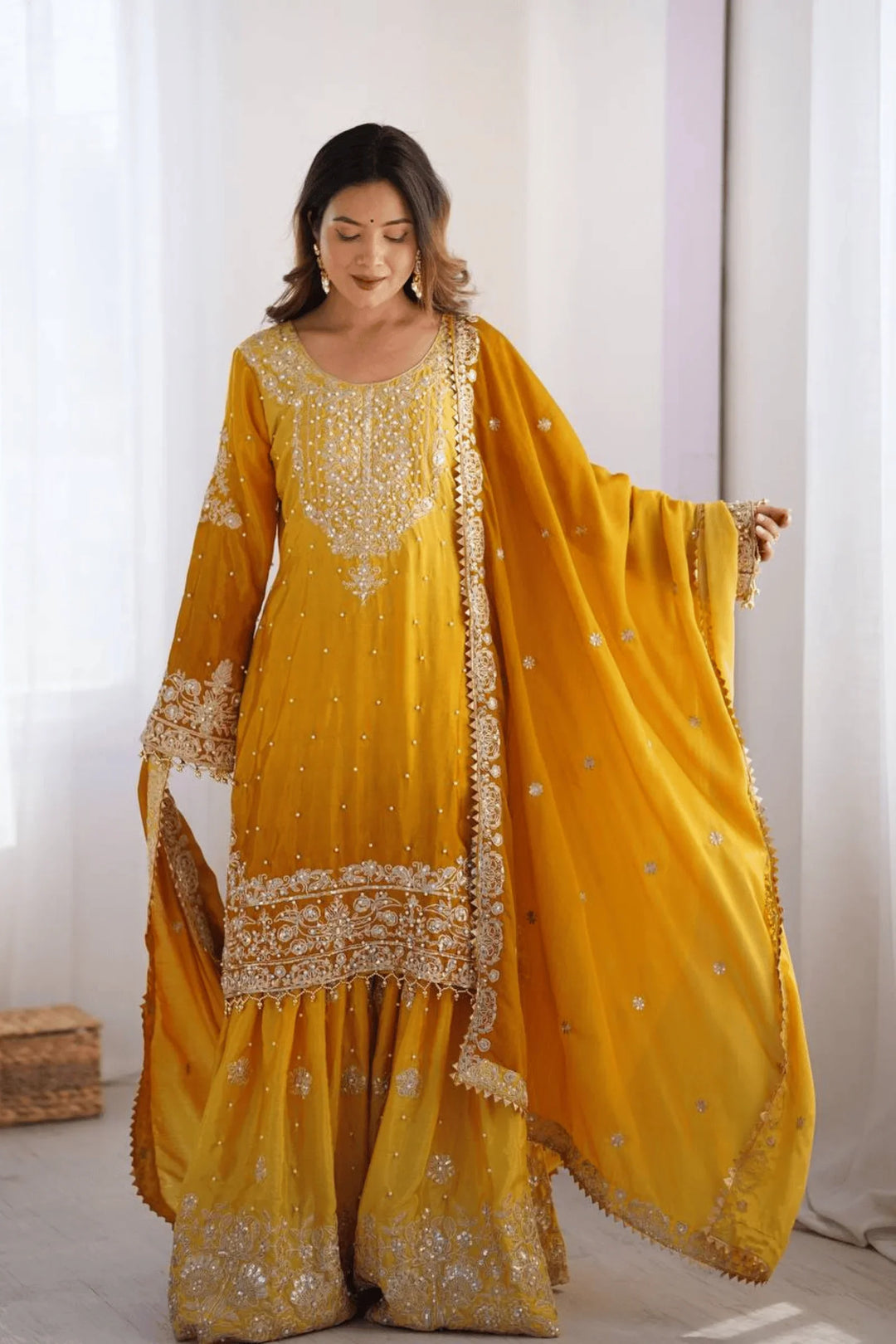 Adorn yourself in elegance with the Glamwiz Golden Mustard Sharara Suit.