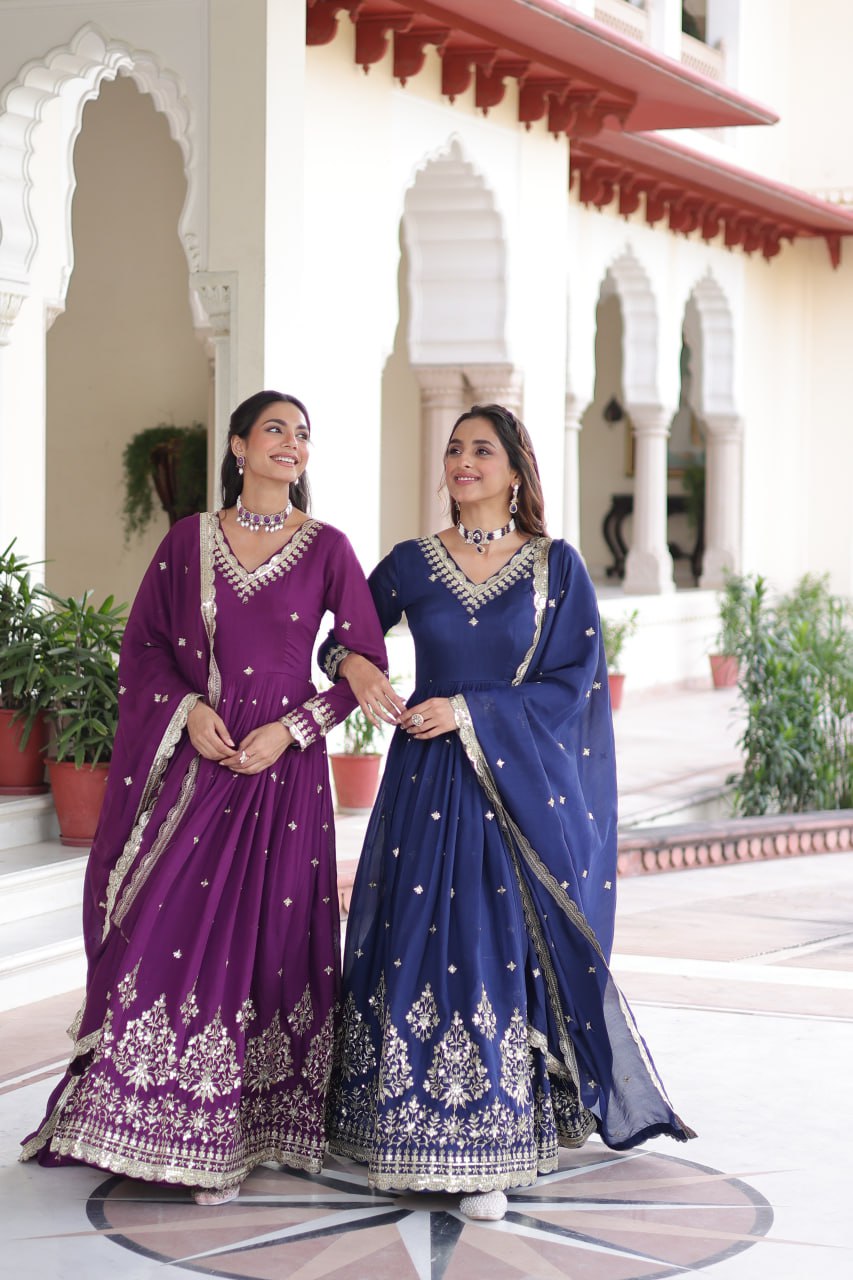 The Noorza Luxe Embroidered Anarkali Gown is a celebration of timeless grace and refined elegance. Crafted in luxurious silk with rich embroidery and a subtle shimmer, it creates a flowing silhouette that exudes regal charm. Designed for festive occasions and special celebrations, this gown blends traditional artistry with modern sophistication for a truly captivating look.