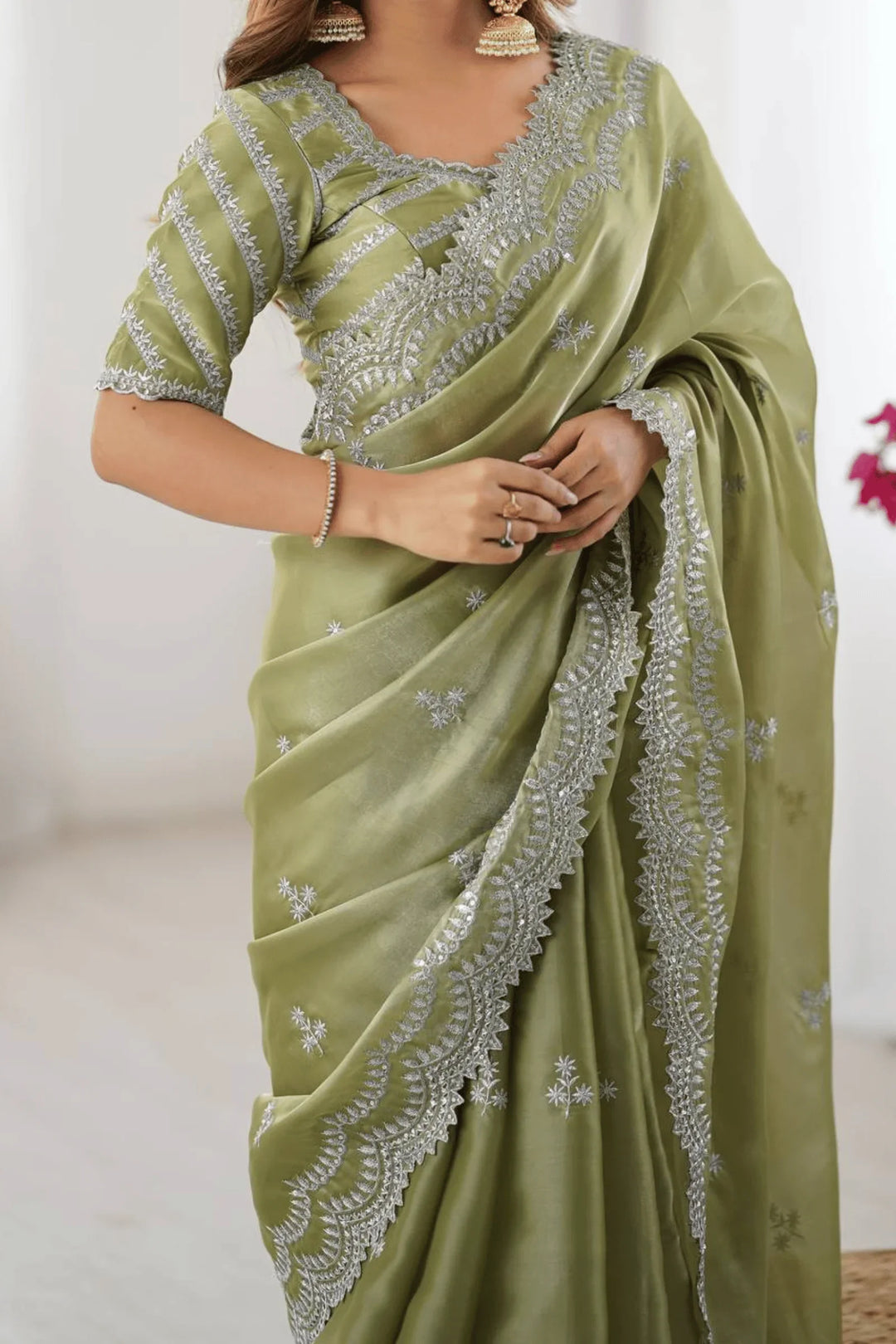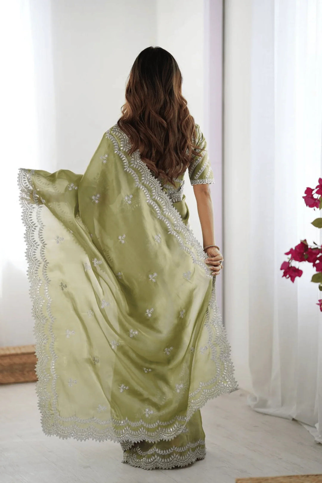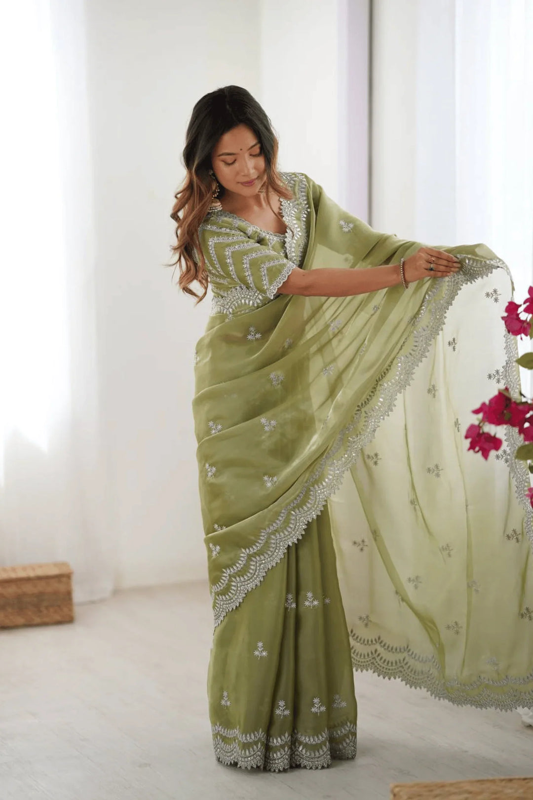 Indulge in the ethereal beauty of the Ready-to-wear Pastel Pistachio Jimmy Choo saree, a perfect saree for Diwali or wedding season. The saree's vibrant hue is ideal for wedding occasions. This ready-to-wear saree come along with unstitched blouse 1 mtr blouse.