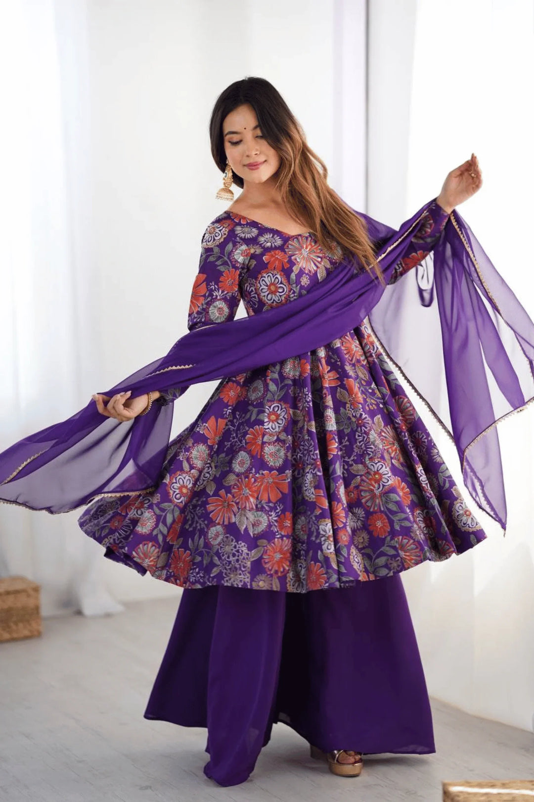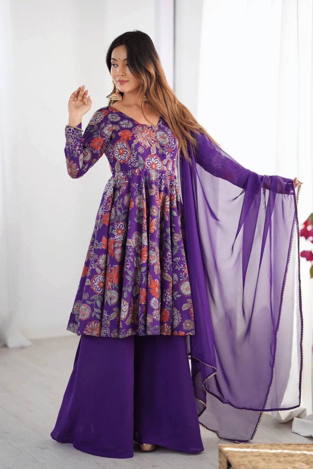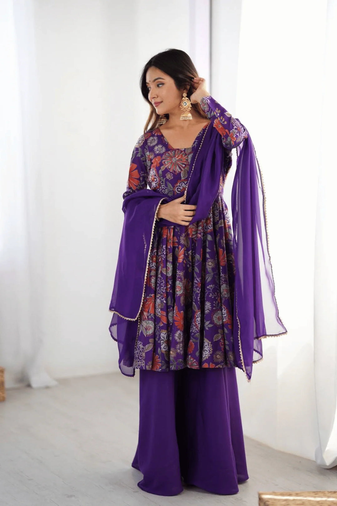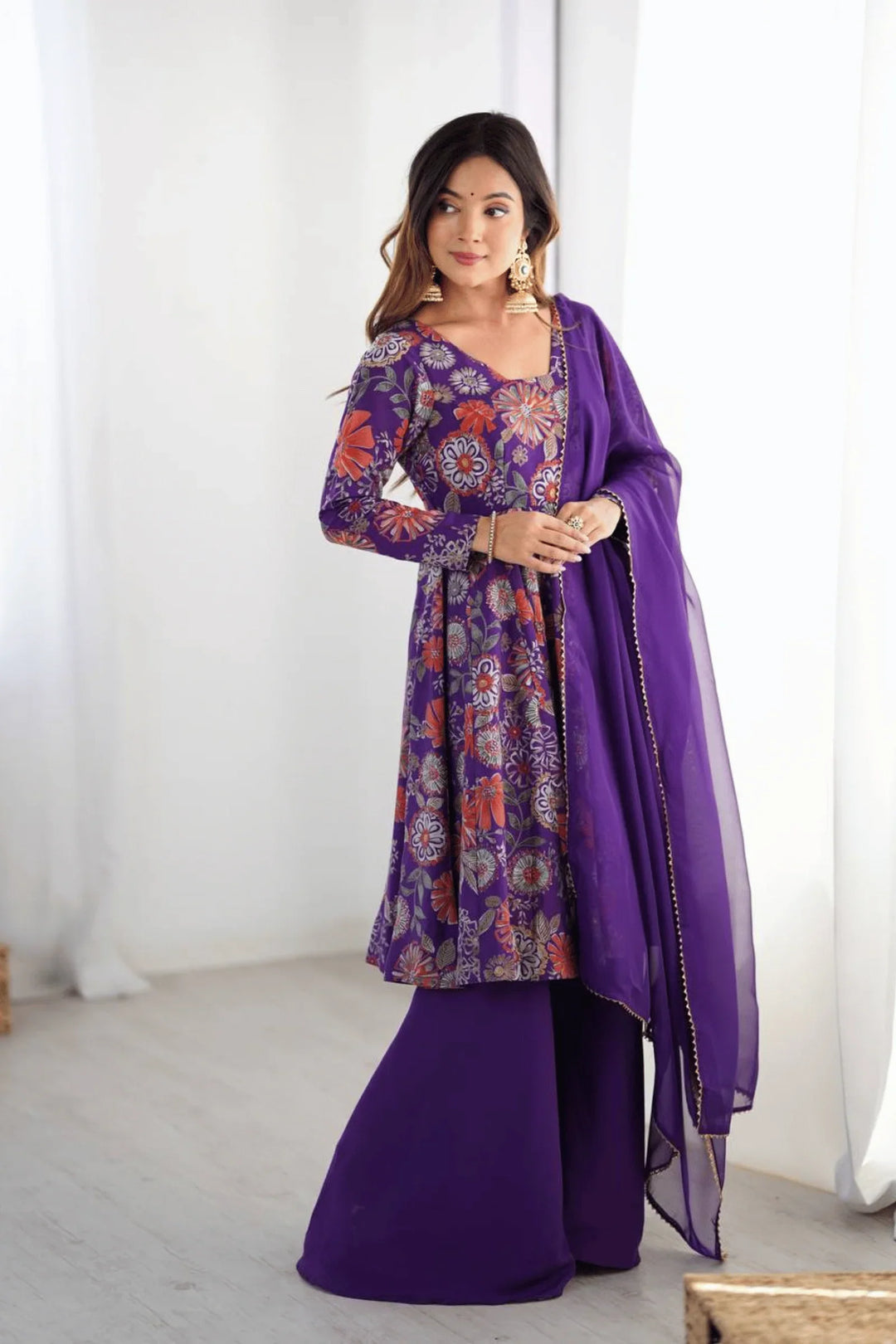 Indulge in opulence with our Sharara suit, a stunning creation from GlamWiz that harmoniously marries tradition with modern allure. Adorned with Phulkari Fusion, this ensemble radiates sophistication, making it a perfect choice for both festive occasions and special gatherings where you want to make a statement with your style.