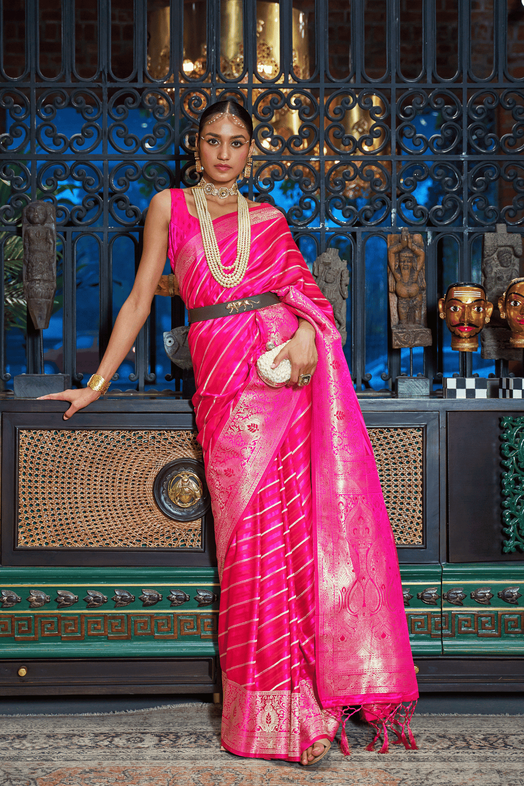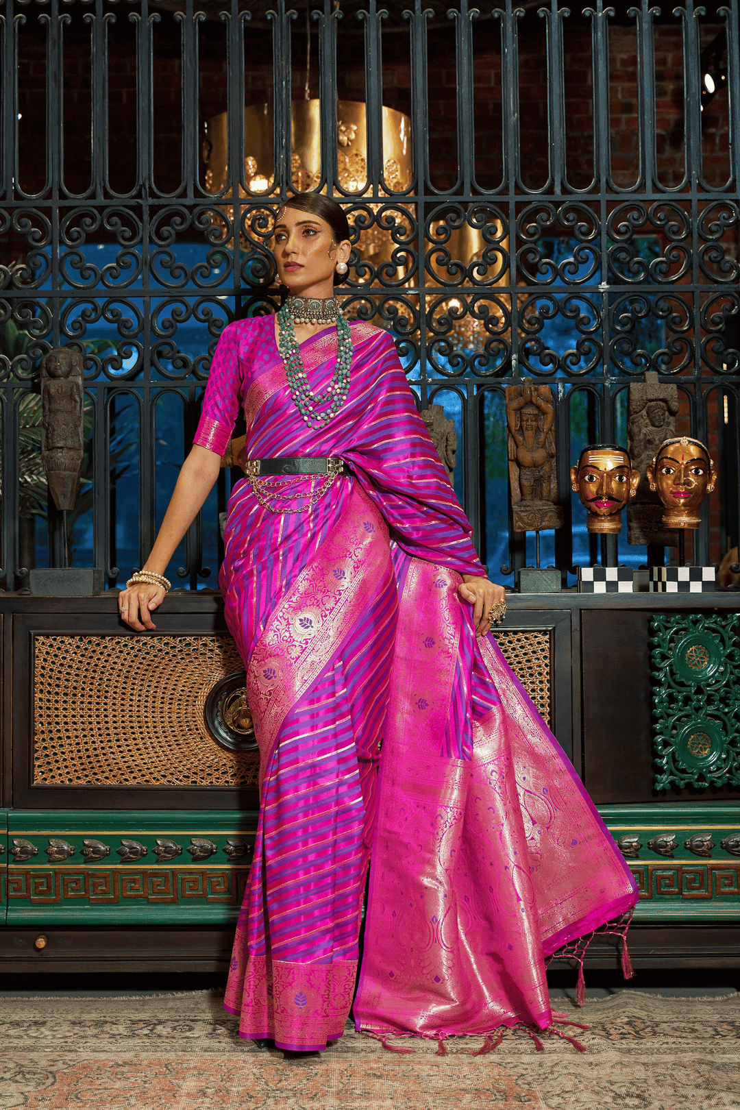 Introducing Ready to wear Kanjeevaram Silk saree with Leheriya weaving across the saree. The silk saree comes along with tone-to-tone matching blouse. This saree is pre-pleated with readymade waist pleats.The hooks do NOT show up as they are practically invisible. Just wear a petticoat /pant/skirt and you are ready to drape it! Fits from 28" waist upto 42" waist.