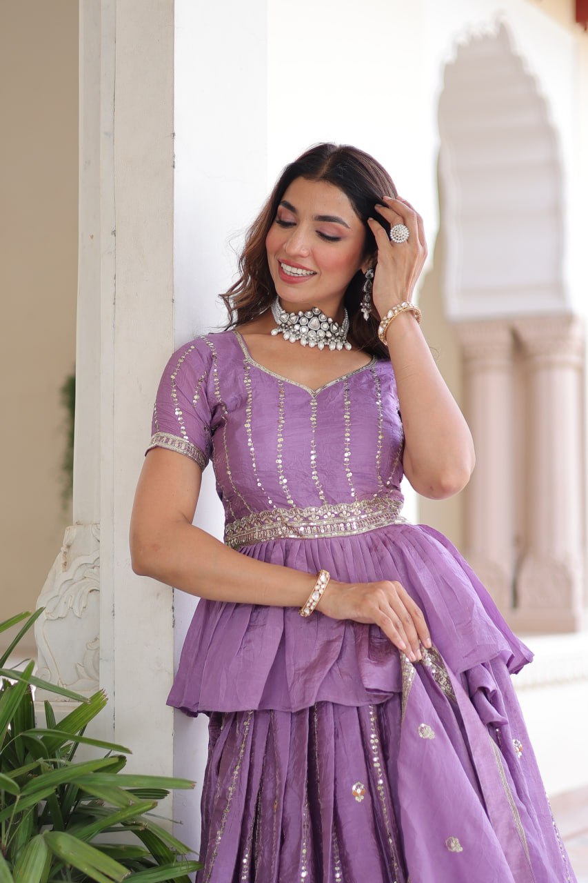 Shine with timeless charm in the Regal Orchid Sequin Embroidered Lehenga Set. Crafted in luxurious Gold Crush fabric, this pastel purple-toned ensemble, rich zari detailing, and shimmering sequins. The lehenga with its graceful flair pairs beautifully with the peplum blouse and the intricately embroidered dupatta. Perfect for weddings, celebrations, and grand occasions, this set radiates elegance and effortless sophistication.