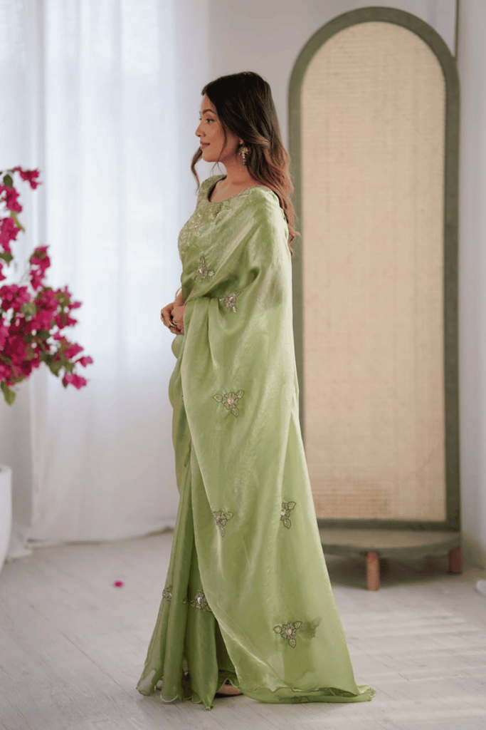The saree features intricate embroidered beadwork that adds a touch of glamour, perfectly complemented by a matching satin blouse with coordinated embroidery.