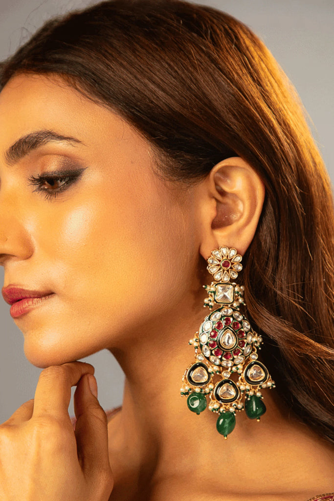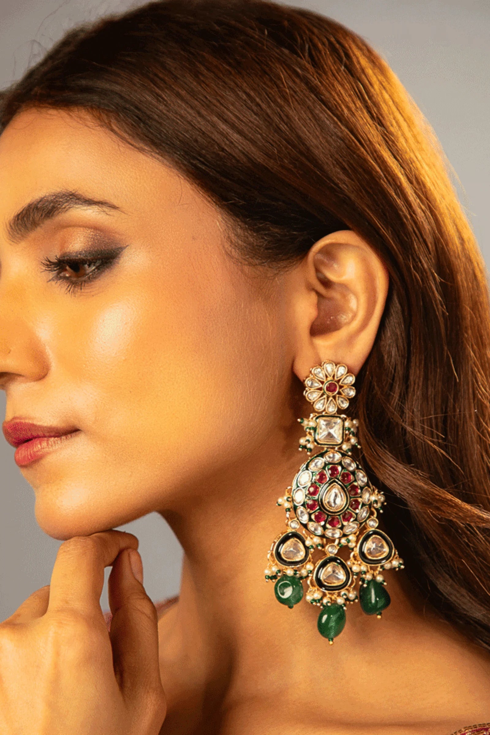 Experience the timeless beauty of India with this exquisite Ruby Emerald Jadau Maangtika Earrings Set. The set features a beautiful maangtika and matching earrings, adorned with kundan work and sparkling ruby red pearls.