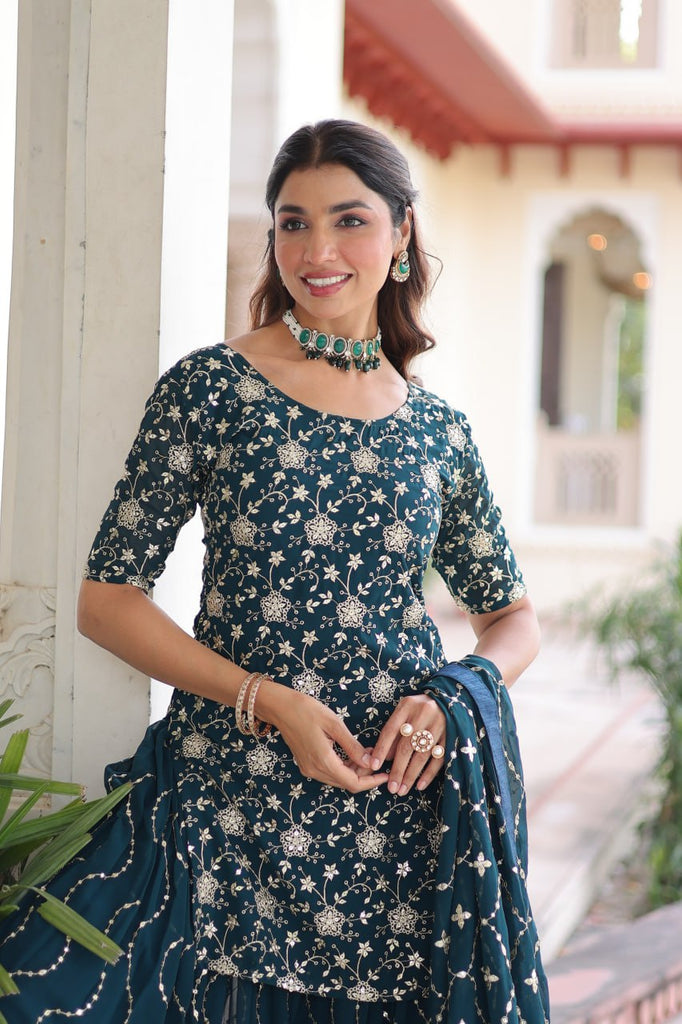 Shine effortlessly in the SparkleMist Sharara Suit. Its delicate shimmer and intricate sequin embroidery create a festive, elegant look, perfectly complemented by a flowing sharara and matching dupatta. Ideal for weddings, celebrations, or any occasion where you want to dazzle.