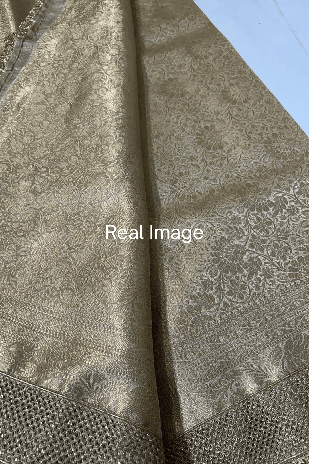 The Pearl Dusk | Pre Stitched Ivory Banarasi Tissue Saree