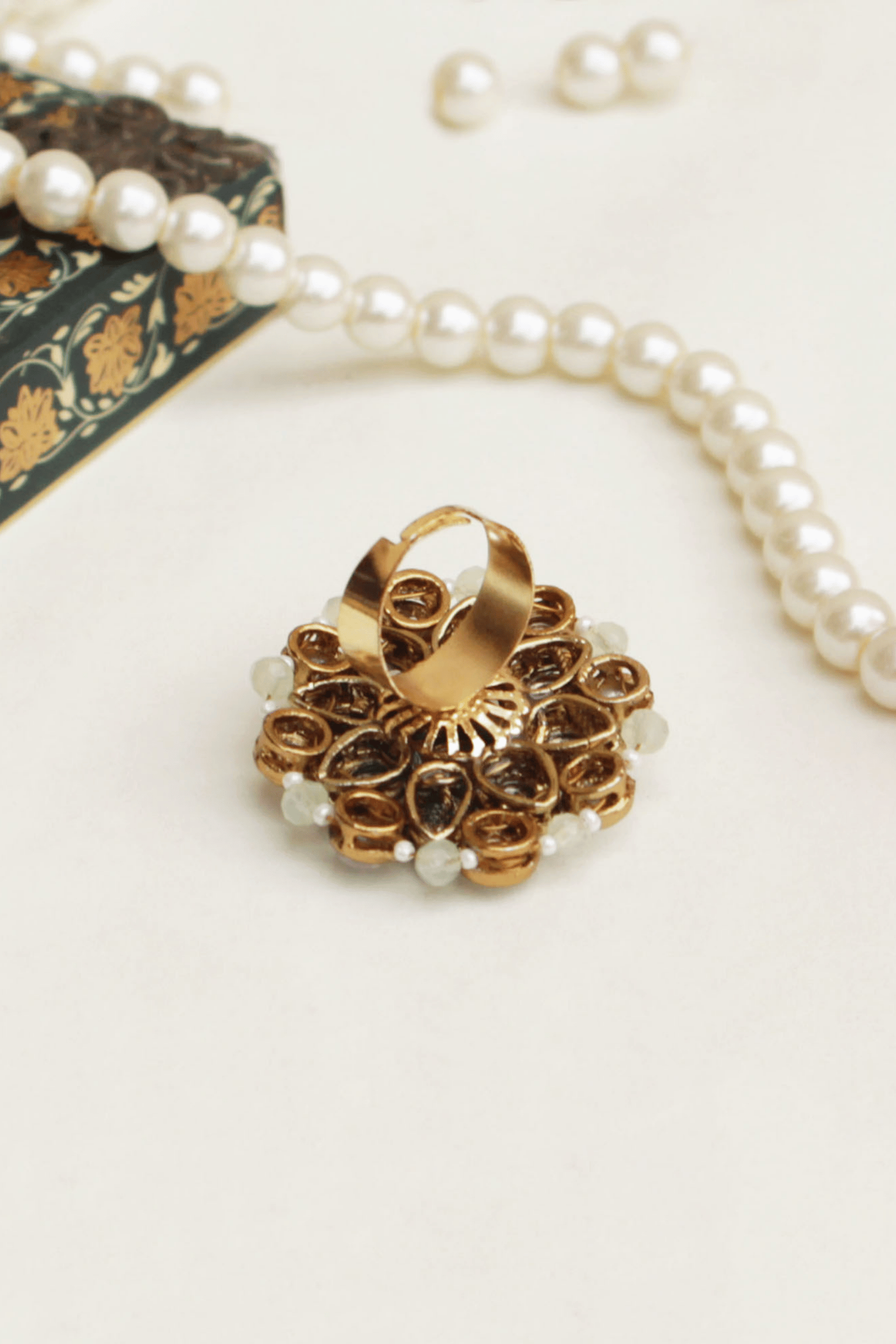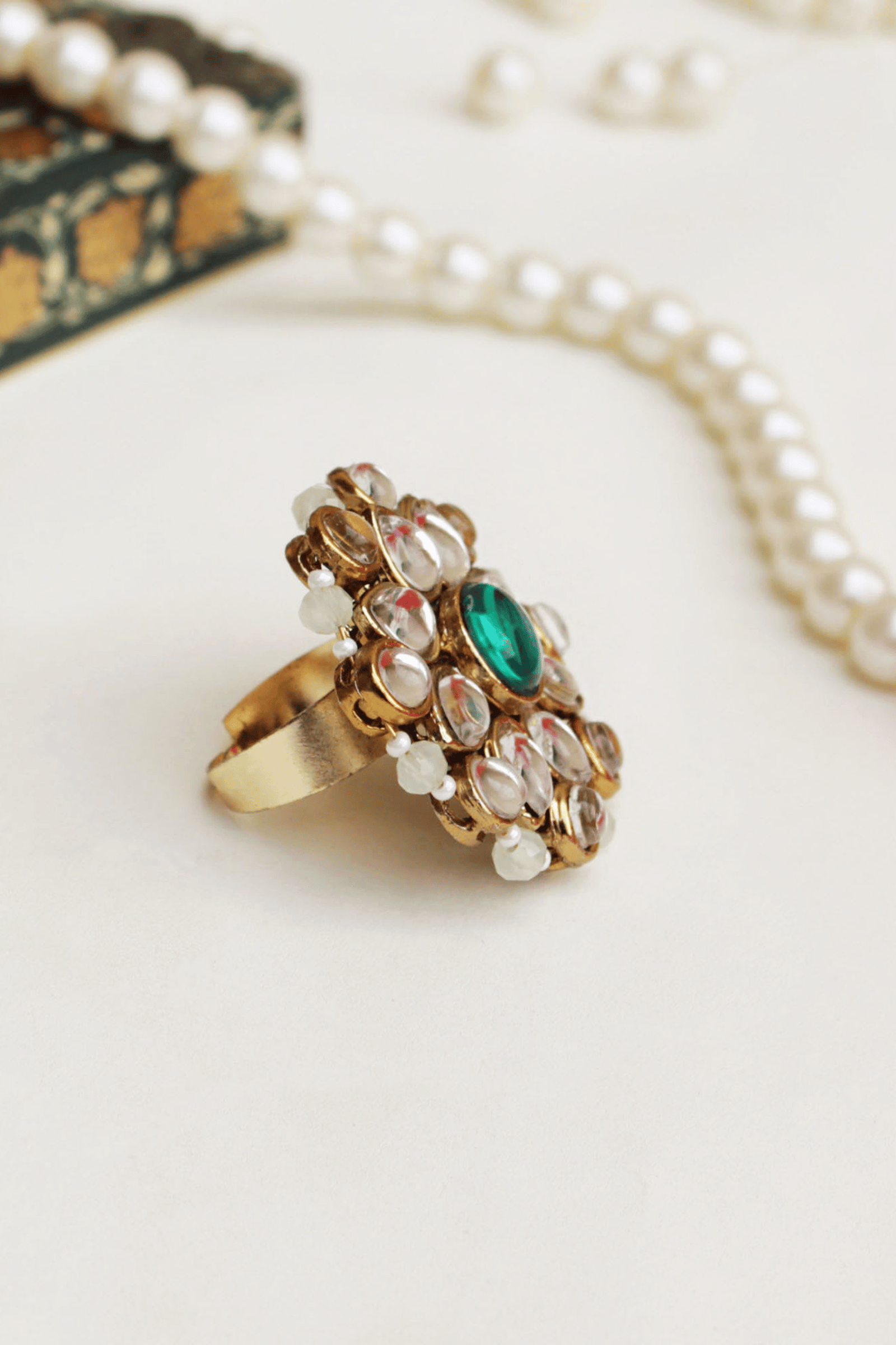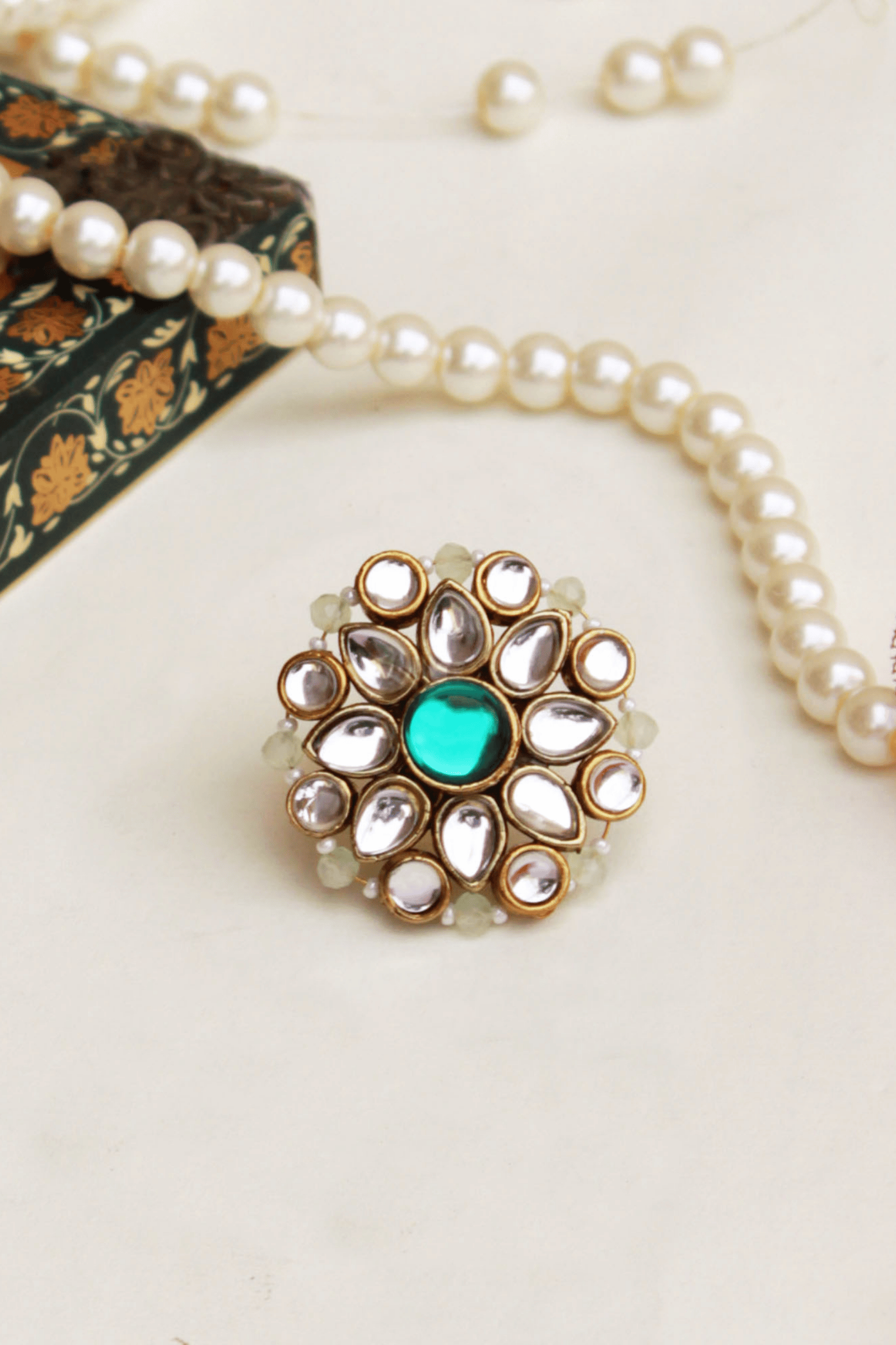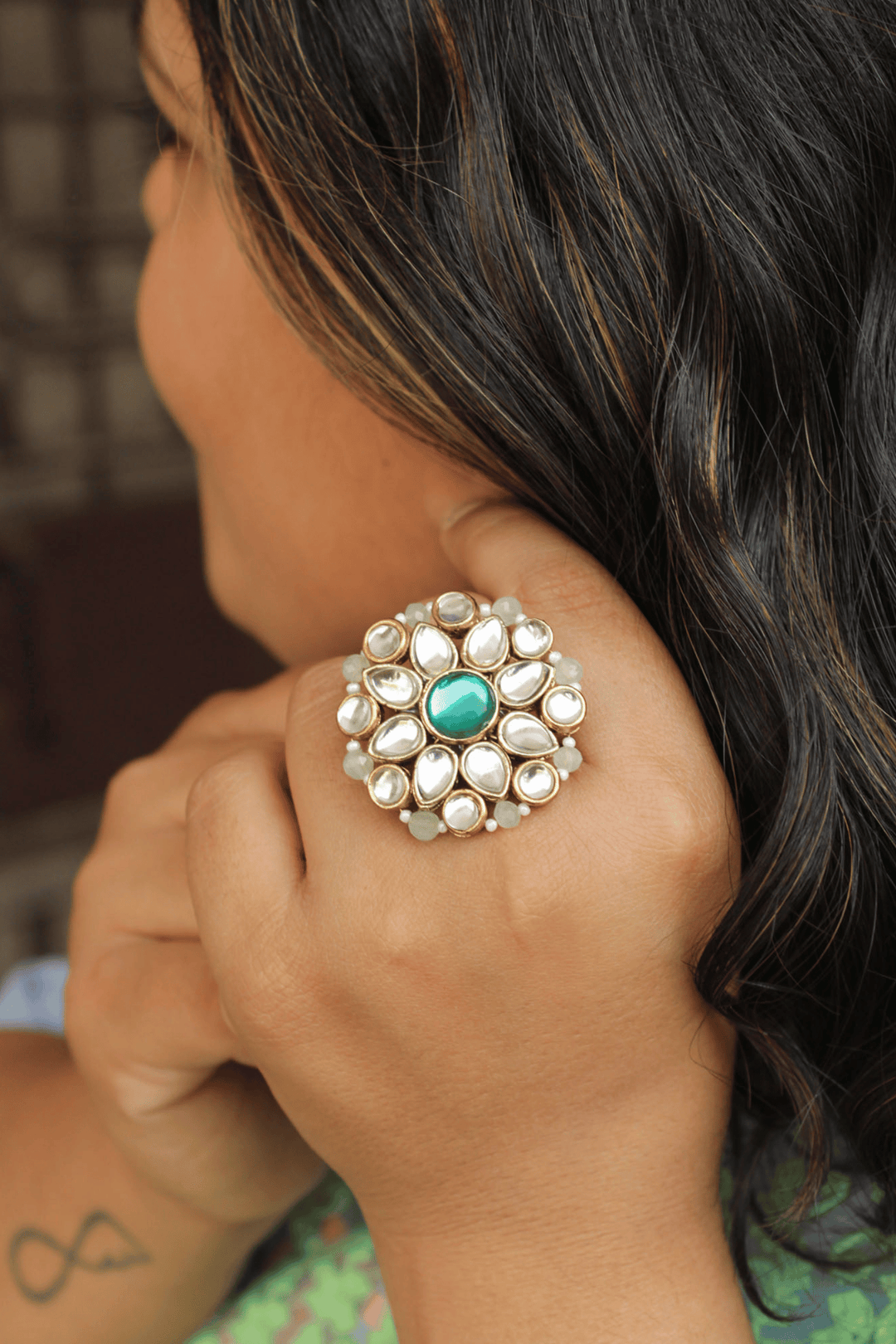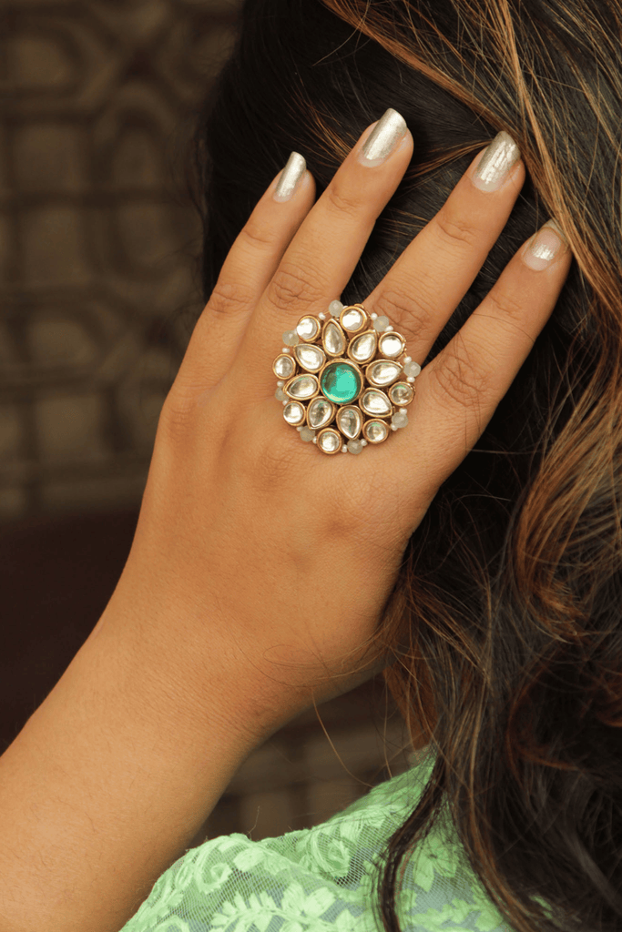 Featuring a round shaped cocktail Ring with big green kundan in middle adorned with pear shaped kundan all around. The ring exudes grace in its kundan work with moti piroi work. An adjustable statement Kundan ring that is a must have design in your wardrobe