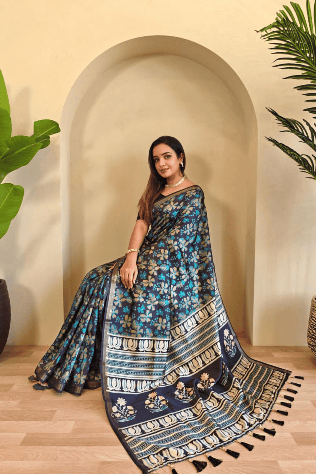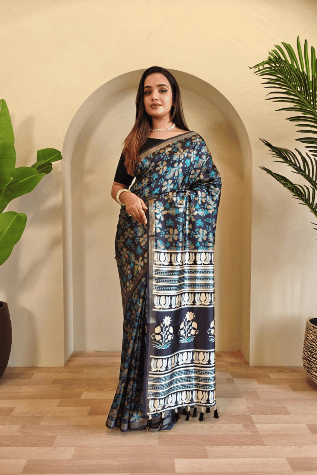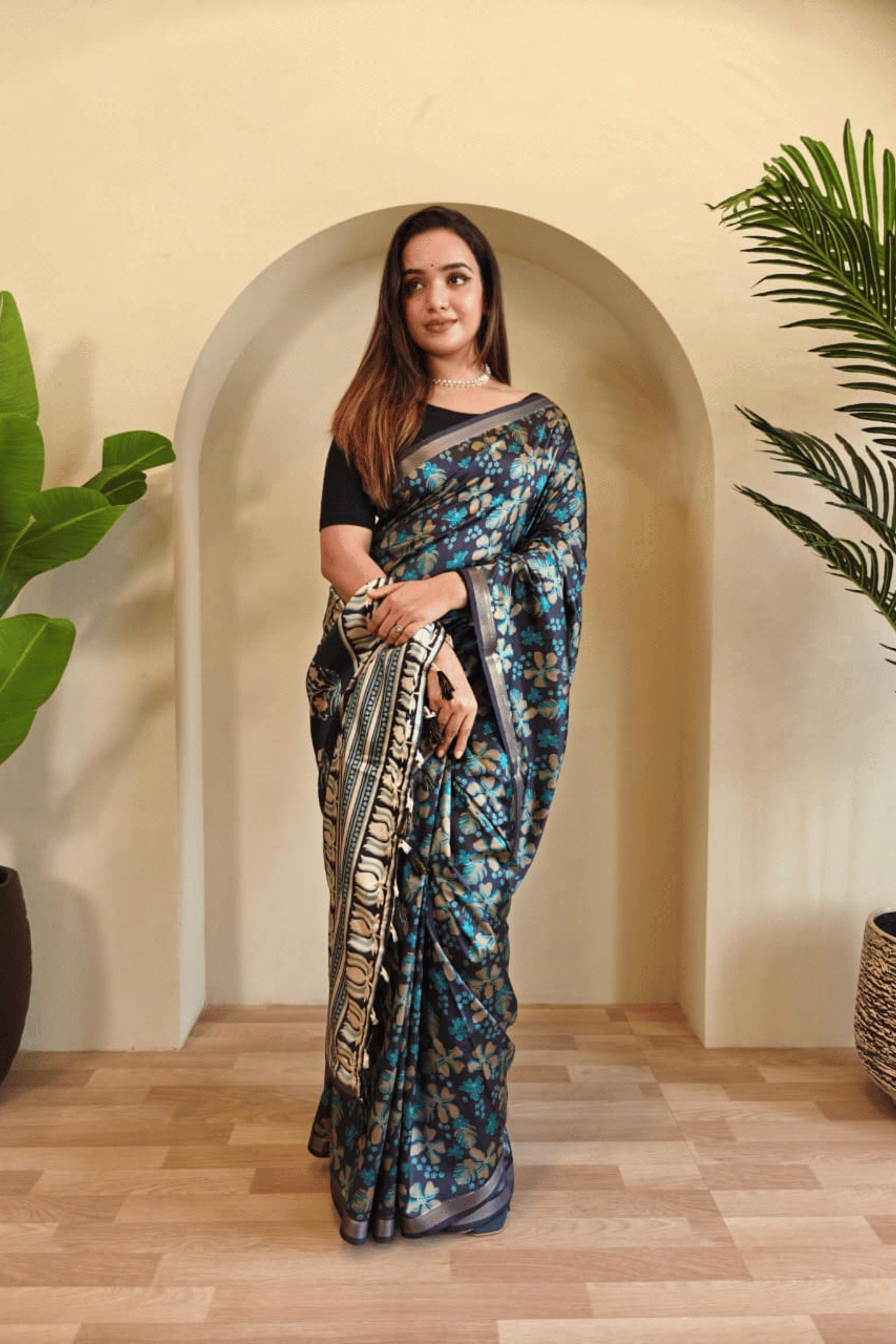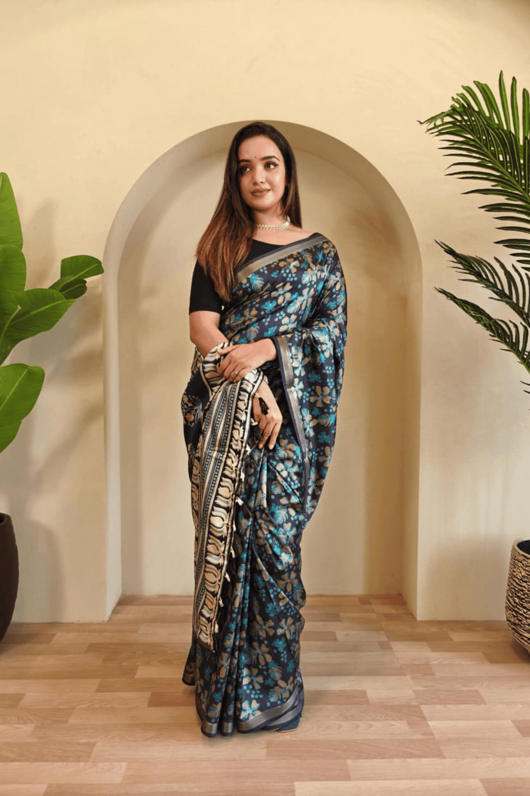 Indulge in the timeless elegance of our Ready to Wear Printed Cotton Crepe Saree. Crafted with exquisite tissue, this saree boasts a mesmerizing electric hue that exudes opulence.