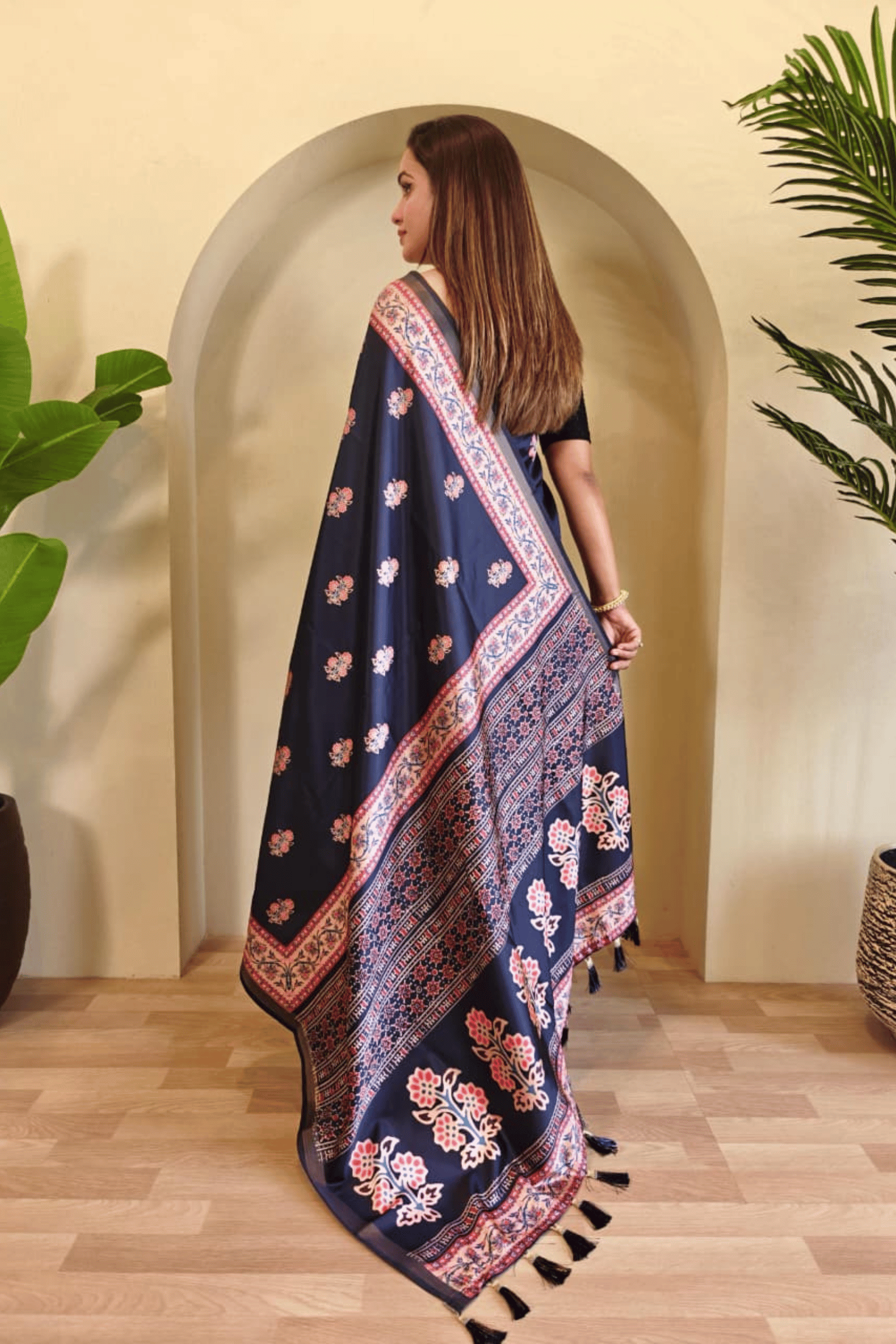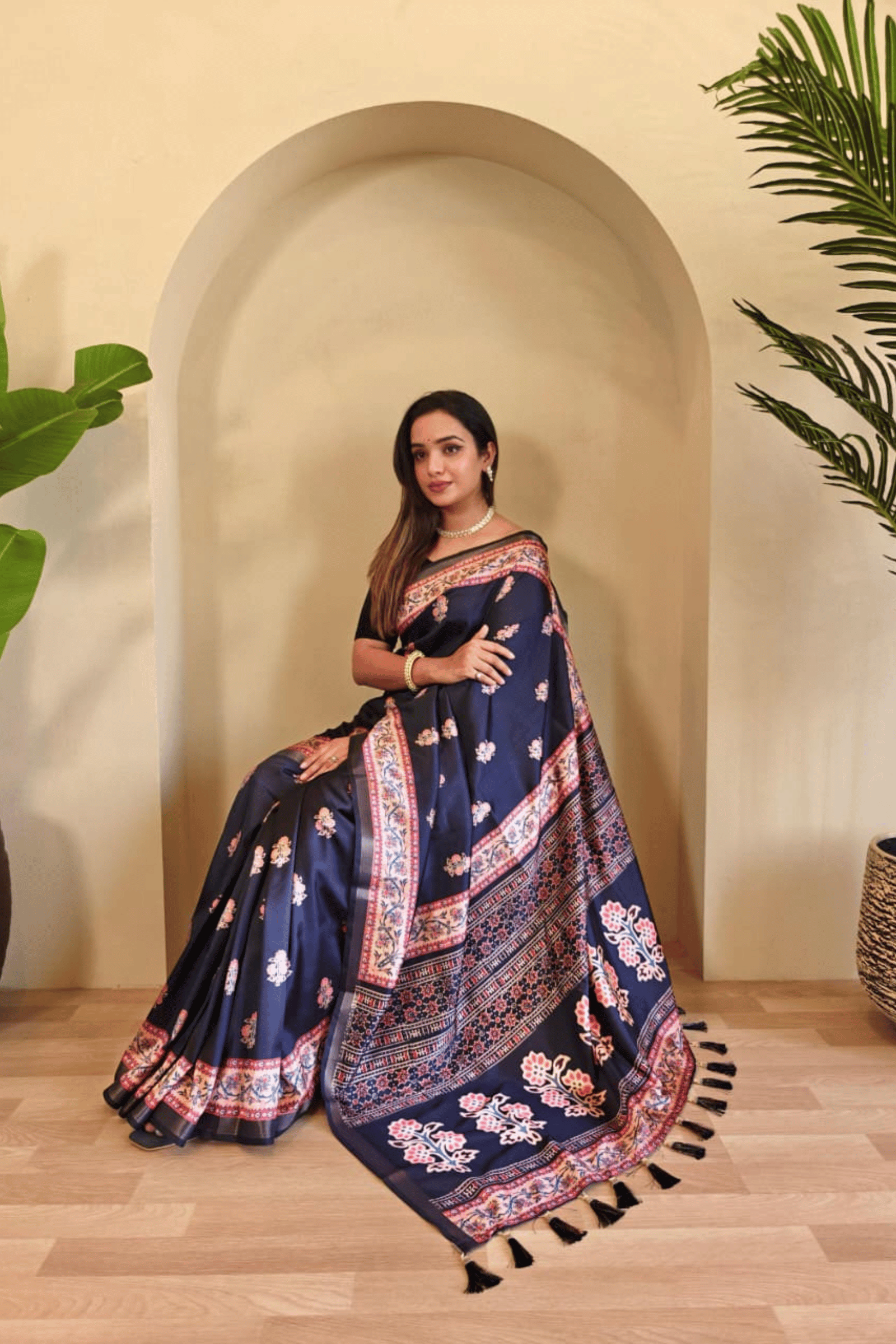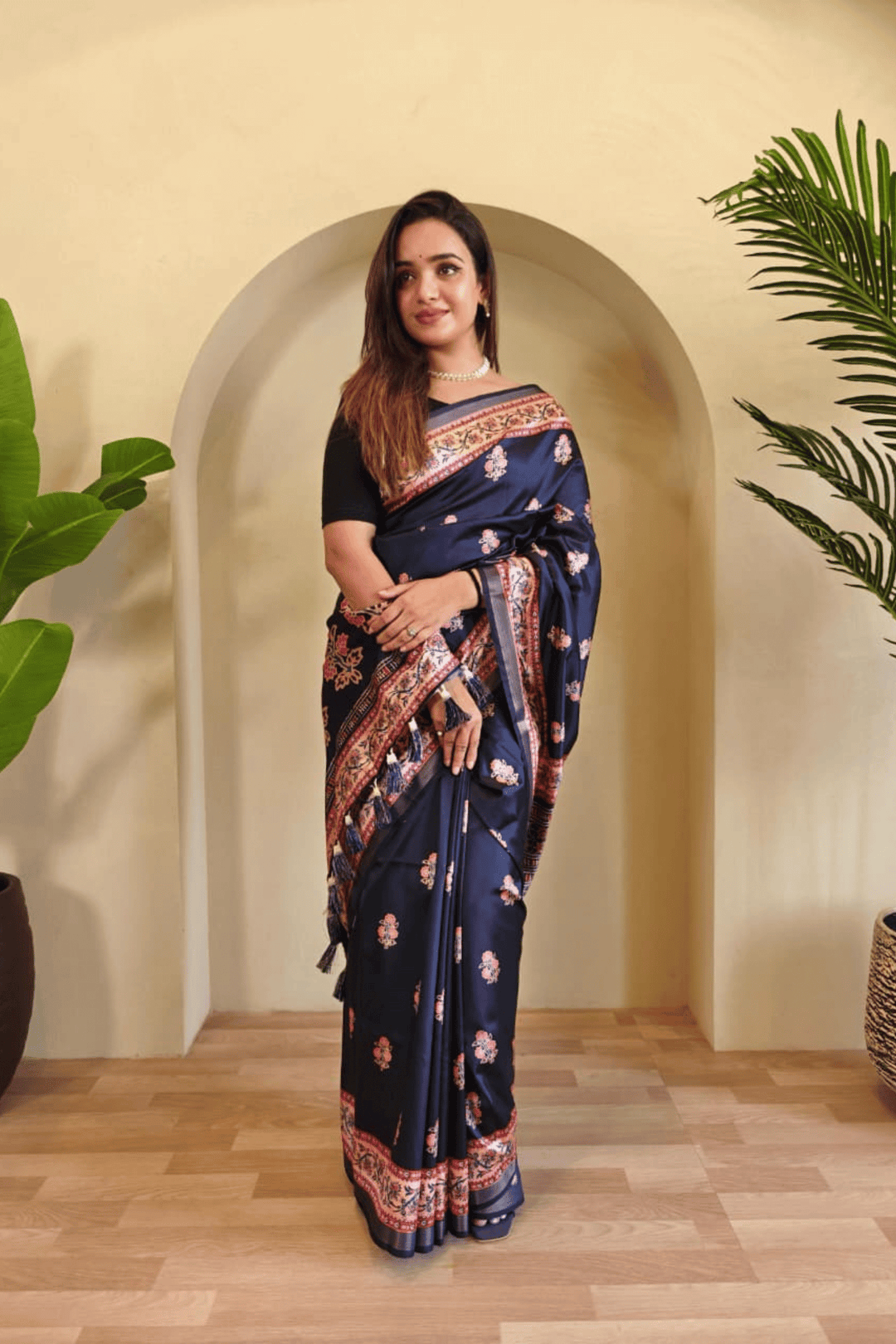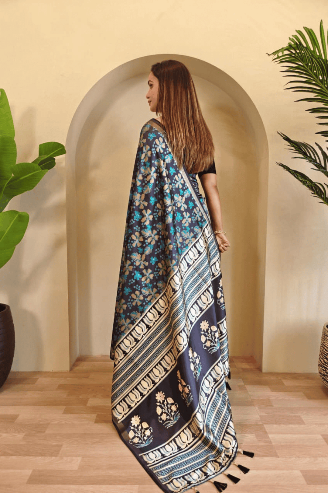 Indulge in the timeless elegance of our Ready to Wear Printed Cotton Crepe Saree. Crafted with exquisite tissue, this saree boasts a mesmerizing electric hue that exudes opulence.